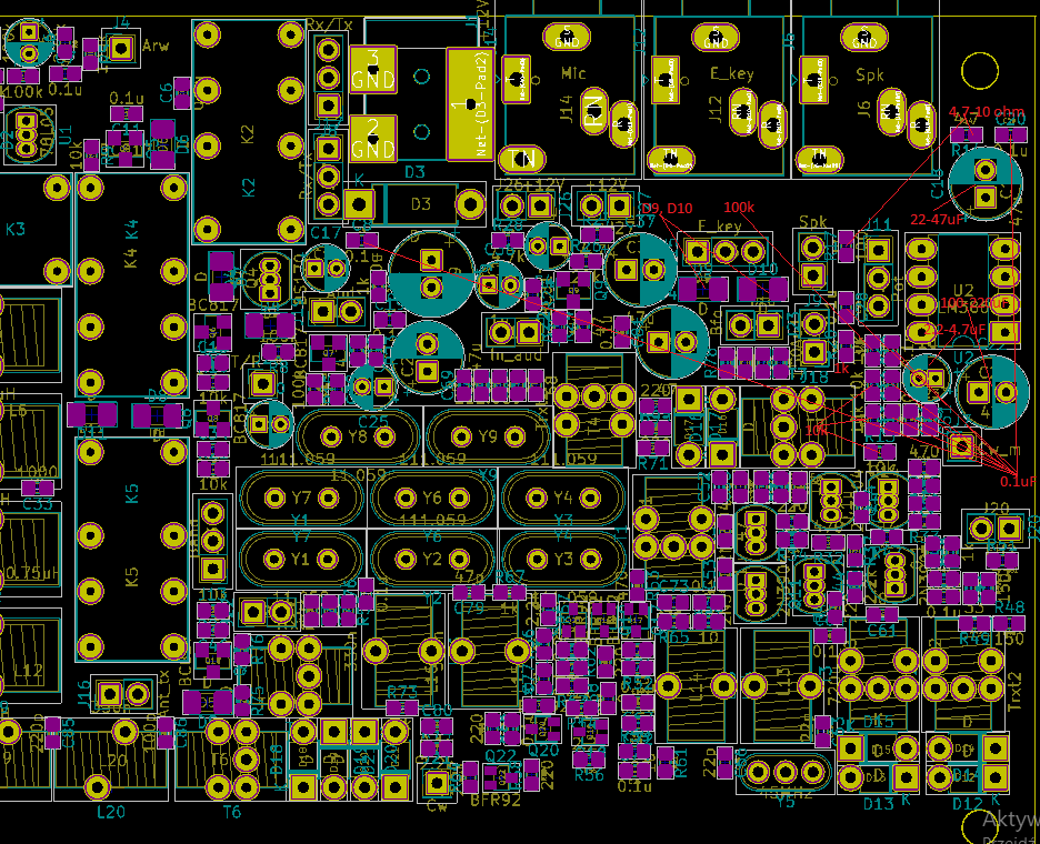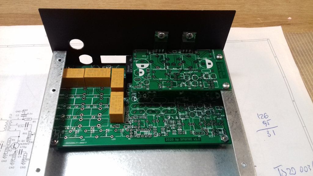 Płytki robiłem 'pod obudowę' 140x140x65mm pokazaną wcześniej i wydaje się, że z automatyką i generatorem na płycie frontowej uda się jeszcze wstawić zasilacz o odpowiedniej mocy. Na pokazanym zdjęciu zamontowałem już kilka większych elementów - głównie przekaźniki. Z tyłu płytki są wszystkie gniazda (antena, zasilanie, mikrofon, klucz i głośnik). Ilość połączeń została ograniczona do minimum - głównie są to przewody sterujące z logiki transceivera.