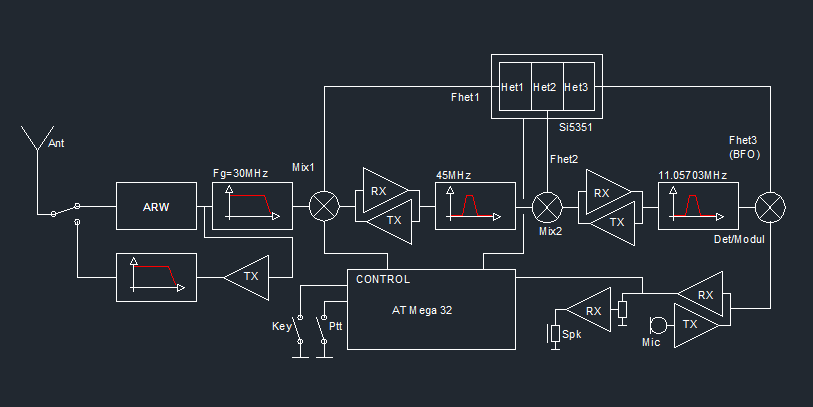 Rysunek pokazuje ogólna ideę działania urządzenia. Sygnał odbierany, początkowo mieszany jest ze strojoną heterodyną aby uzyskać częstotliwość pośrednią 45MHz, następnie jest wzmacniany i mieszany powtórnie ze stałą heterodyną w wyniku tego uzyskuje się pośrednią ok. 11.05xMHz a sygnał filtrowany jest w filtrze kwarcowym 11.05xMHz. Właściwą wstęgę odbioru uzyskuje się przez zastosowanie odpowiedniej częstotliwości BFO, z zasady odbiera się ostatecznie górną wstęgę sygnału drugiej pośredniej a więc generator BFO ma częstotliwość nieco niżej niż częstotliwość przenoszenia filtra kwarcowego.