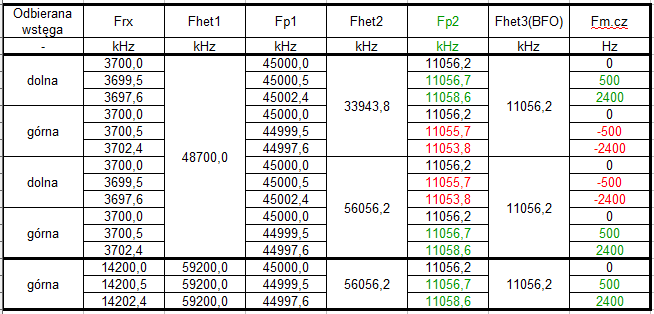 Jak wspomniałem, na 3.5MHz odbieramy częstotliwości dolnej wstęgi a więc jeśli heterodyna ustawiona jest do odbioru 3.7MHz to powinniśmy odbierać częstotliwości od ok. 300 do 2400Hz poniżej częstotliwości 3.7MHz. Pierwsza sekcja tabeli dla 3.5MHz pokazuje w jaki sposób odbierane są częstotliwości 3.7MHz, 3.6995 oraz 3.6976 (dolna wstęga), sekcja druga pokazuje jak odbierane są częstotliwości 3.7MHz, 3.7005MHz i 3.7024 (górna wstęga). Dla obu tych sekcji pokazałem, że ze stałą pierwszą heterodyną oraz stałą drugą heterodyną 33.943.8MHz i sygnałem BFO 11.0562MHz sygnał LSB wpada w pasmo przenoszenia filtra kwarcowego (częstotliwości powyżej 11.0562) a sygnał USB znajduje się poniżej tego pasma.
