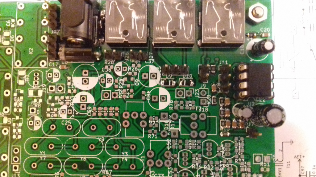 Niestety, jak pisałem wcześniej, nie udało mi się zapanować w odpowiednim czasie nad polaryzacją kondensatorów elektrolitycznych i zanim się zorientowałem, że powinienem to skorygować to płytki były już na produkcji. Dlatego kilka z kondensatorów opisanych na płytce ma niewłaściwie podaną polaryzację. Dla przypomnienia, biała połówka oznaczenia kondensatora na płytce to minus. Na płytce wadliwie są oznakowane kondensatory: C9, C17 i C37. Należy je wlutować odwrotnie niż wskazują oznaczenia. Ja, pomimo wiedzy na o tym, źle wlutowałem kondensator C9 (220-470uF). To główny kondensator filtrujący w zasilaniu i jedynie dzięki kontroli prądu zasilania nie doprowadziłem do eksplozji tego kondensatora. Na szczęście tylko spuchł i po wymianie i właściwym wlutowaniu wszystko wróciło do normy. Tym bardziej zalecam podczas montażu o uwagę i sprawdzenie dwu a nawet trzykrotne czy montaż robiony jest właściwie.