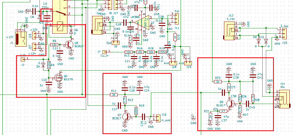 Na początek zacząłem montaż gniazd oraz wzmacniacza m.cz. Montowane elementy zaznaczyłem kolorem czerwonym. Nie ma potrzeby montować złącz J18 i J19. Układ wzmacniacza jest klasyczny, na uwagę może jedynie zasługiwać sekcja zbudowana z elementów: J7, R13, R16, R18, R19, C21, C26, C27, C29. To układ filtra dolnoprzepustowego kształtujący sygnał prostokątny monitora CW - z logiki transceivera, do postaci sygnału sinusa o odpowiednio wytłumionej amplitudzie doprowadzonego na wejście wzmacniacza m.cz. Dioda w obwodzie zasilania - D3, to dioda o prądzie 3A. Ponieważ zasilanie do nadajnika będzie prowadzone z płytki odbiornika to dlatego potrzebna jest tu dioda o podwyższonym prądzie. Diody D9 i D10 oraz inne diody nie działające w mieszaczach to diody typu smd 1N4148.