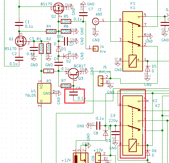 Tu na uwagę zasługuje odwrócony opis dla kondensatora - trzeba go wlutować odwrotnie niż pokazuje opis na płytce. Natomiast zarówno opis dla 78L05 jak i tranzystorów BS170 okazał się prawidłowy. Niemniej w sieci można spotkać różne opisy wyprowadzeń dla 78L05 więc zalecam sprawdzenie jak wlutować posiadany układ. Niestety, dioda D5 wylądowała dość daleko od swojego przekaźnika i na dobrą sprawę można z niej zrezygnować.