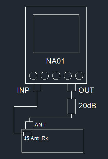 Układ pomierzyłem za pomocą NA01 w pasmie 1-30MHz w pokazanym układzie pomiarowym. Pomiar może być dokonany za pomocą każdego innego analizatora ale zwracam uwagę aby odbywał się dla 'małych' sygnałów pomiarowych co oznacza napięcia co najwyżej 0.2V dlatego wtrąciłem na wejście odbiornika tłumik 20dB.