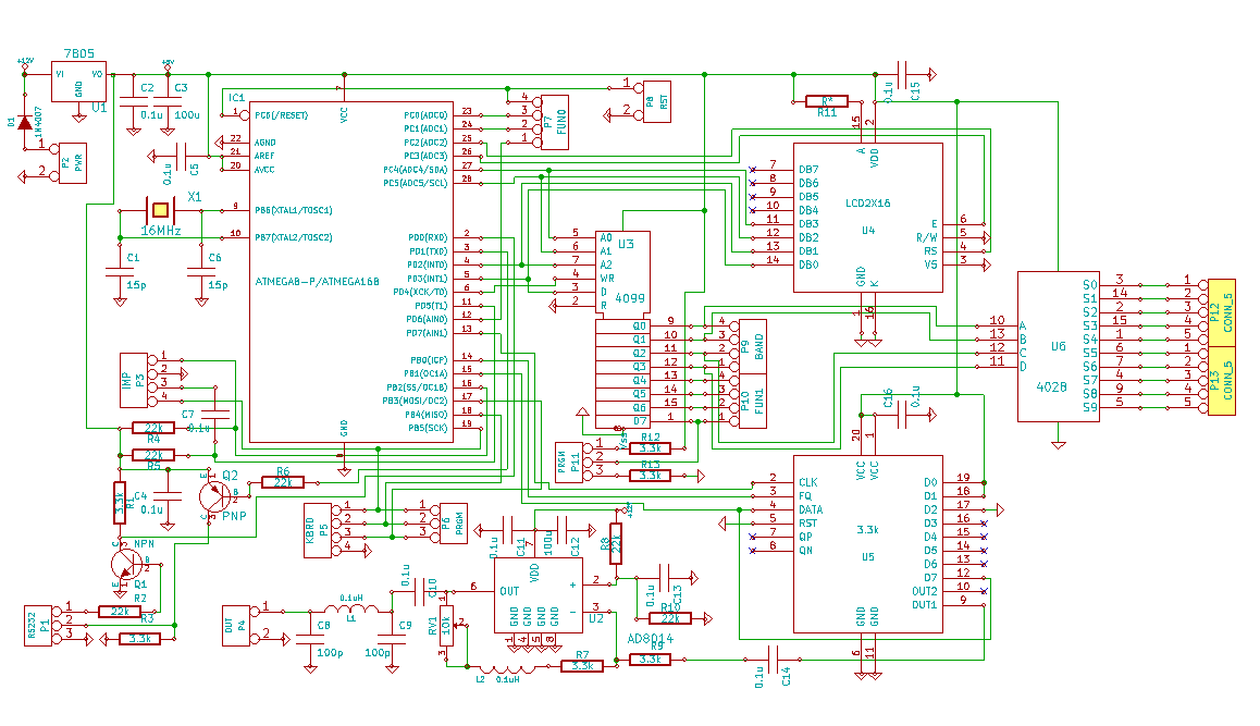Zamknąłem część "hardware" projektu generatora projektem płytki drukowanej, która jest już w produkcji i za mniej więcej 2 tygodnie pojawi się gotowa do montażu. Ostatecznie płytka główna ma rozmiar 60/90mm, do tego 5 klawiszy, wyświetlacz i gniazdo na gotowy moduł generatora AD9850. Wprowadziłem również drobne zmiany w schemacie urządzenia. Ponieważ zostało mi trochę miejsca na płytce to wstawiłem dodatkowo dekoder 1 z 10 CD4028 co pomoże np. w bezpośrednim wystawieniu do 8 sygnałów sterujących np. przełącznikiem pasm. Oczywiście układ nie musi być montowany wtedy potrzebny będzie jakiś dekoder zewnętrzny.