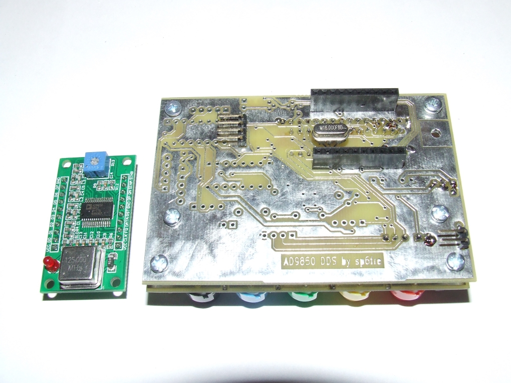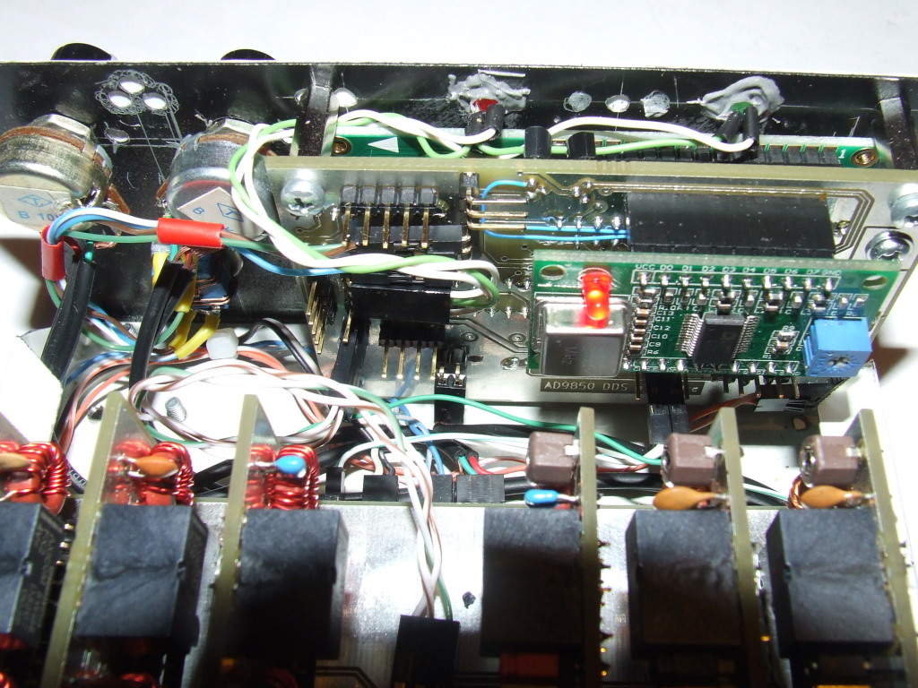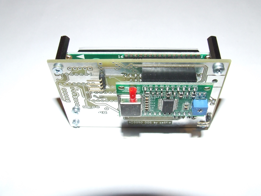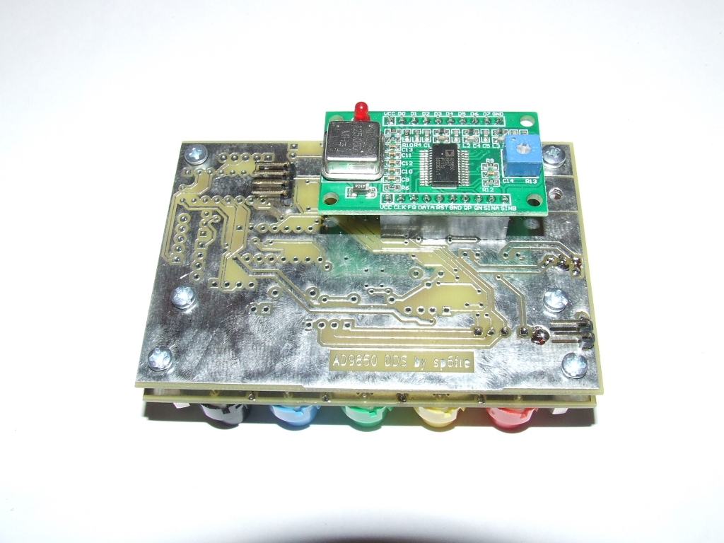 Pomimo tej wstępnej porażki reszta na razie się sprawdza. Nie zdążyłem jeszcze uruchomić układu ale zmontowałem go mechanicznie i przygotowałem do wstępnego programowania i uruchomienia. Na zdjęciach widać jak to wszystko będzie wyglądać. Klawiatura ma 5 przycisków i będzie wspomagana impulsatorem oraz przełącznikeim w osi impulsatora. Całość będzie samonośna, montowana do płyty czołowej za pomocą sześciokątnych wsporników gwintowanych M3. Gotowy generator 9850 "made in China" wstawiany jest w gniazda z tyłu płytki. Zamierzam wykonać generator Tiny DDS bis możliwie uniwersalnie co będzie głównie zależeć od oprogramowania ale będzie go można stosować do urządzeń z bezpośrednią przemianą jak i z programowanymi pośrednimi z dodatkową możliwością położenia pośredniej względem hetrodyny dla każdego pasma. W układzie znajdzie się sporo sygnałów sterujących logiką transceivera, w tym przełącznik pasm, wejścia pomiarowe i co fantazja przyniesie a na co pamięć układu pozwoli ;-) Szkoda tylko, że nadchodzące pilne obowiązki ograniczą na jakiś czas moją aktywność w tym temacie a także w temacie trx-a cw :-(
