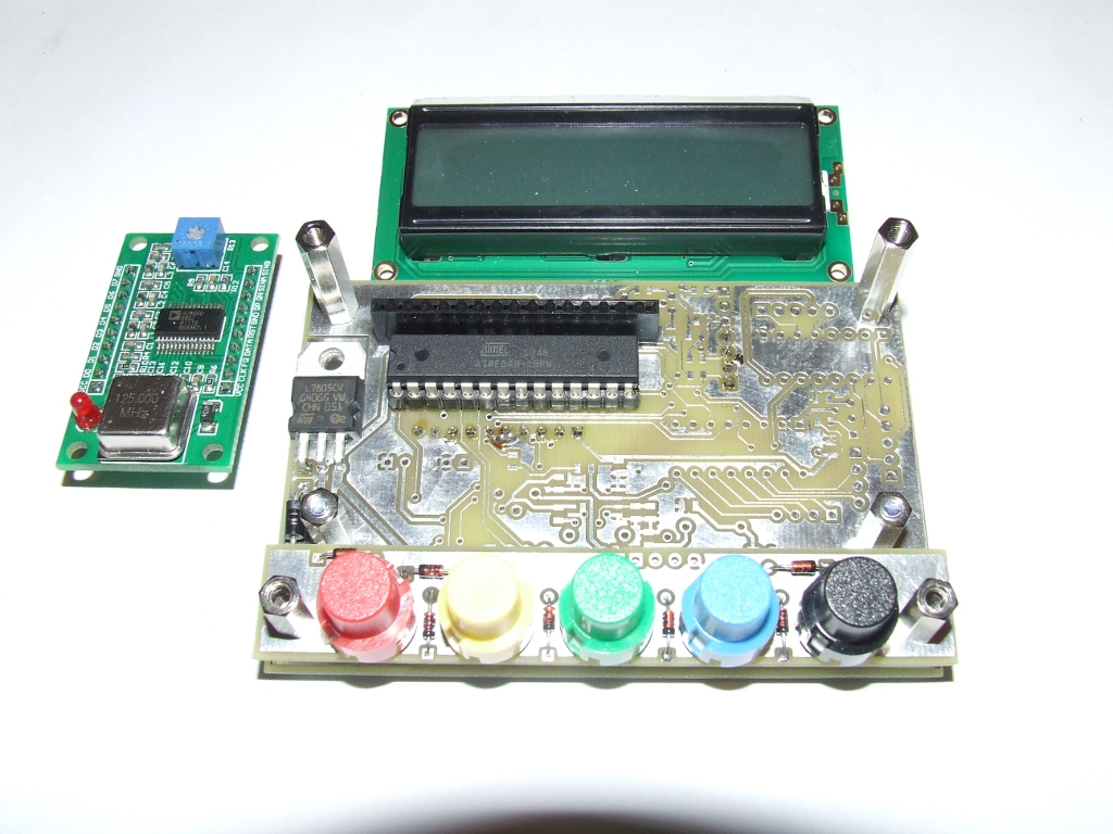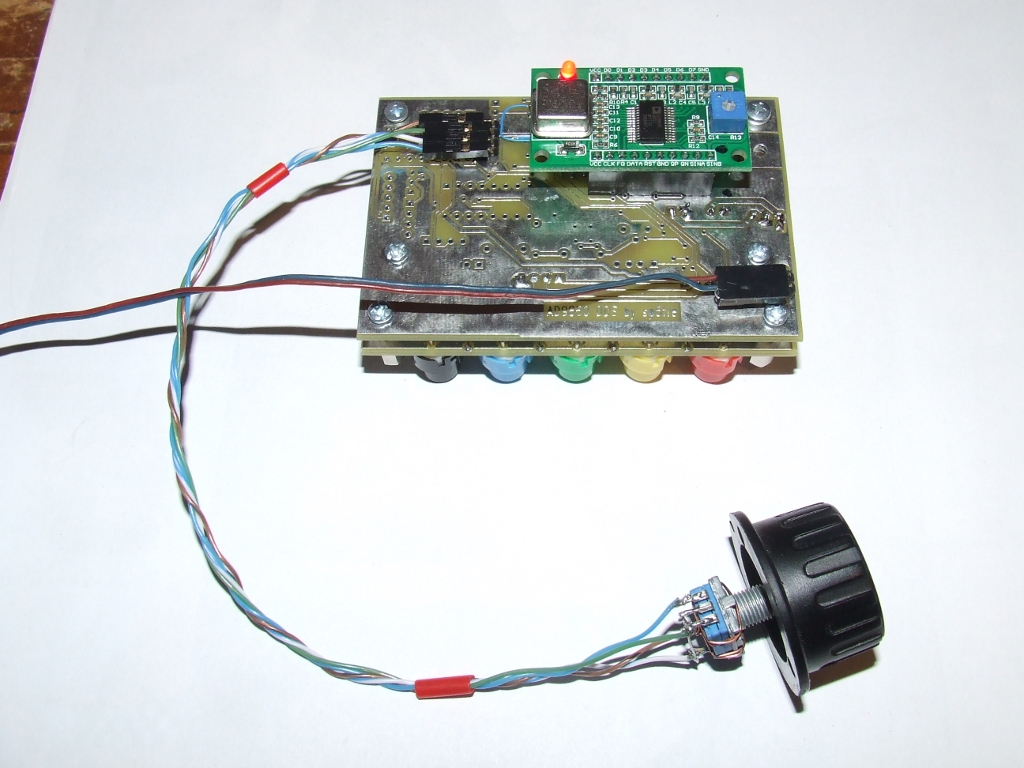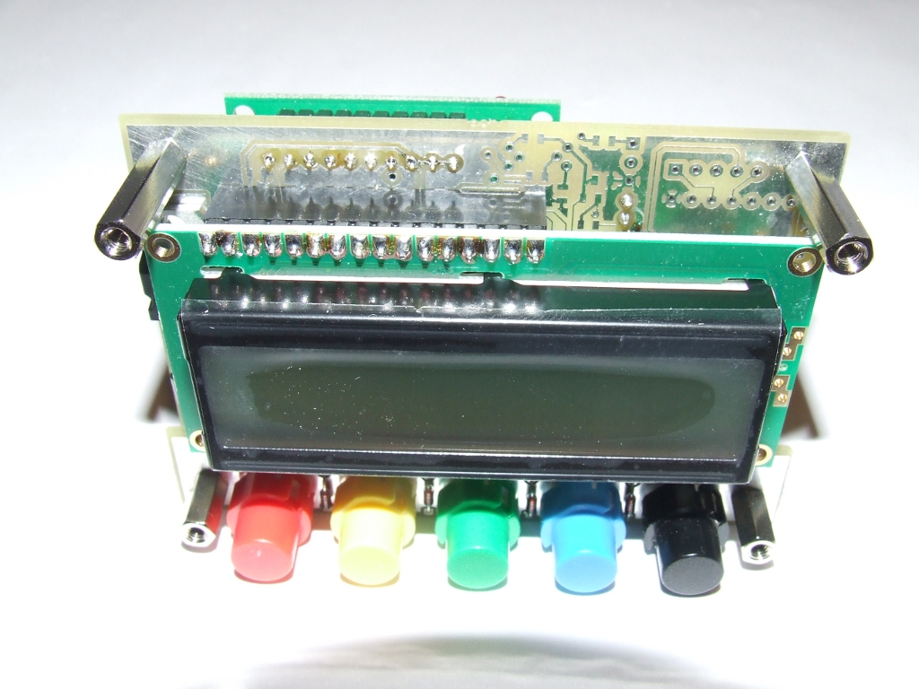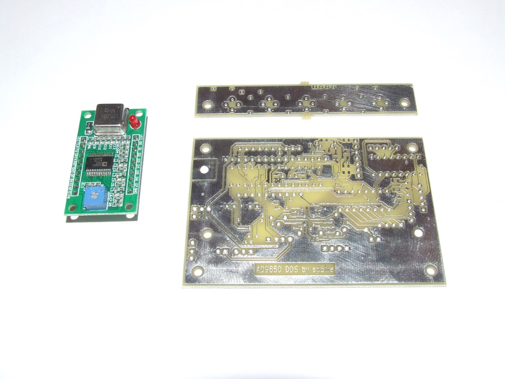 Pomimo tej wstępnej porażki reszta na razie się sprawdza. Nie zdążyłem jeszcze uruchomić układu ale zmontowałem go mechanicznie i przygotowałem do wstępnego programowania i uruchomienia. Na zdjęciach widać jak to wszystko będzie wyglądać. Klawiatura ma 5 przycisków i będzie wspomagana impulsatorem oraz przełącznikeim w osi impulsatora. Całość będzie samonośna, montowana do płyty czołowej za pomocą sześciokątnych wsporników gwintowanych M3. Gotowy generator 9850 "made in China" wstawiany jest w gniazda z tyłu płytki. Zamierzam wykonać generator Tiny DDS bis możliwie uniwersalnie co będzie głównie zależeć od oprogramowania ale będzie go można stosować do urządzeń z bezpośrednią przemianą jak i z programowanymi pośrednimi z dodatkową możliwością położenia pośredniej względem hetrodyny dla każdego pasma. W układzie znajdzie się sporo sygnałów sterujących logiką transceivera, w tym przełącznik pasm, wejścia pomiarowe i co fantazja przyniesie a na co pamięć układu pozwoli ;-) Szkoda tylko, że nadchodzące pilne obowiązki ograniczą na jakiś czas moją aktywność w tym temacie a także w temacie trx-a cw :-(