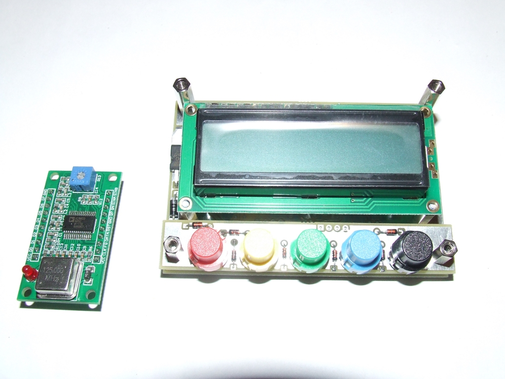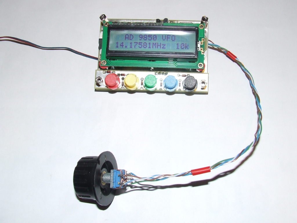Działa mi sterowanie modułu AD9850 oraz klawiatura. Możliwa jest zmiana kroku sterowania: 10Hz, 20Hz, 100Hz, 1kHz, 10kHz, 100kHz oraz 1MHz za pomocą impulsatora z użyciem jego przełącznika osiowego ale można również zmieniać krok z pomocą lewego klawisza (czerwonego na zdjęciu) i impulsatora. To pozwoli na użycie impulsatorów bez funkcji przełącznika na osi. Zmiana częstotliwości generatora odbywa się oczywiście za pomocą impulsatora z wybranym krokiem. Zastanawiam się nad doborem najlepszego zestawu kroków sterowania. Czy na przykład jest sens stosowania kroku 10Hz oraz któregoś z większych, 1kHz lub 10kHz?