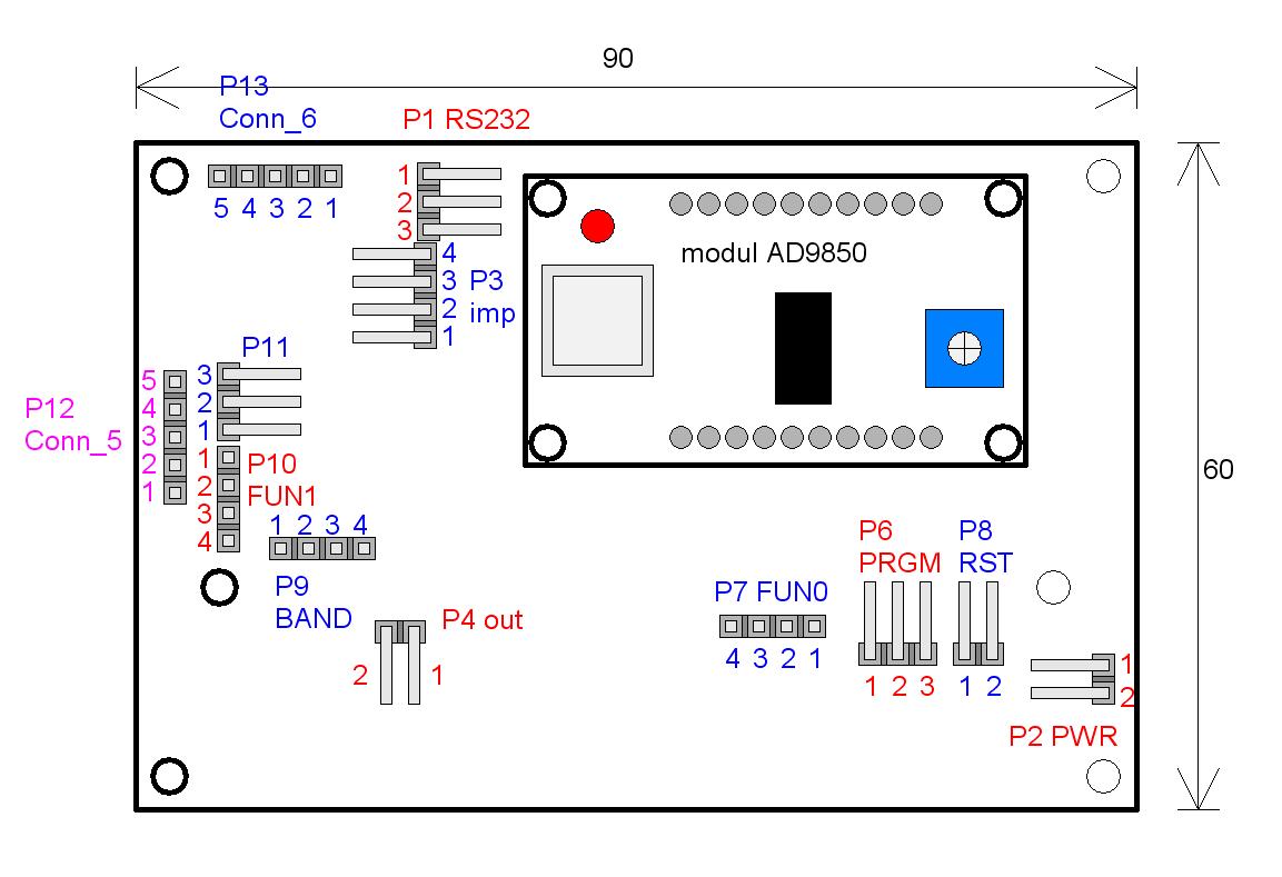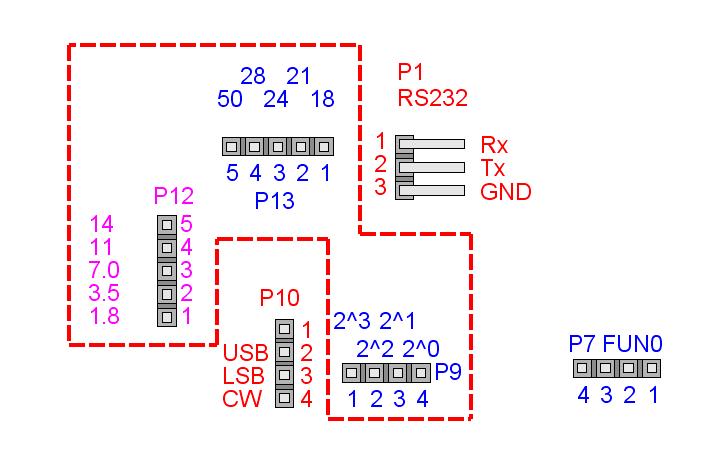 Na styku P10 pojawiać się będą sygnały logicznej jedynki w zależności od wybranego trybu pracy (CW/LSB/USB). Styki P1 i P7 pokazane zoostały jedynie dla porządku. Ze względu na brak miejsca na kod programu nie będą miały przypisanej funkcji. Styk P1 przeznaczony jest do połączenia z PC a styk P7 będzie obsługiwał sygnały analogowe (s-metr oraz stan baterii). Te i inne dodatkowe funkcje pojawią się dopiero w wersji na procesor z pamięcią 16k, który pasuje do obecnej podstawki.