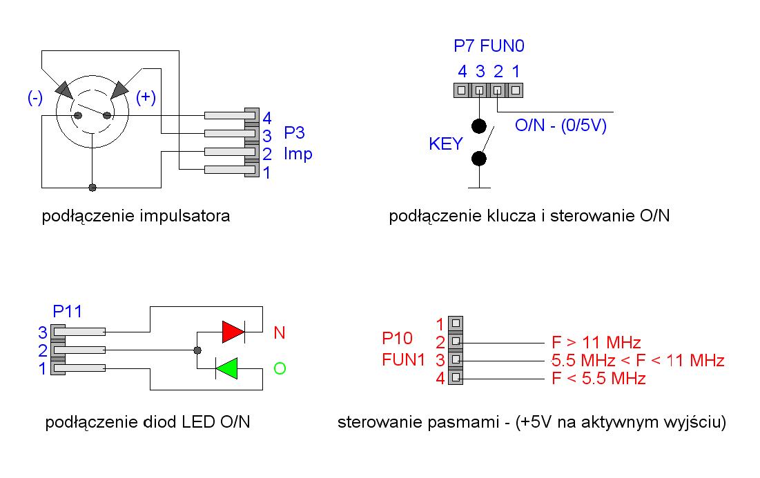 Na złączu P10 pojawia się logiczna jedynka (+5V) automatycznie w zależności od aktualnej częstotliwości pracy na odpowiednim pinie tego złącza. Układ może być przestrajany impulsatorem z przełącznikiem lub bez (krok można zmieniać również za pomocą prawego, skrajnego klawisza). Jeśli impulsator nie ma przełącznika na osi to pin 4 P3 będzie oczywiście niepodłączony. Jeśli jednak ten przełącznik jest i zostanie podłączony to możliwa jest zmiana kroku przestrajania po wciśnięciu przełącznika osiowego i obrót impulsatora.