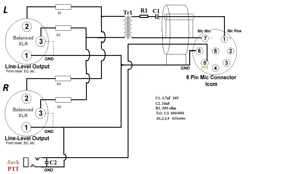 Ten uproszczony schemat może poprawnie dzałać z mixerami audio, należy sie liczyć z możliwością występowania wzbudzeń pod wpływem pola w.cz.