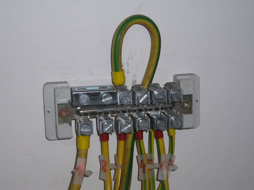 W rzeczy samej. Poniżej wygląd takiej listwy, gdzie jest doprowadzony główny przewód uziemiający oraz przewody uziemiające z poszczególnych odbiorników.