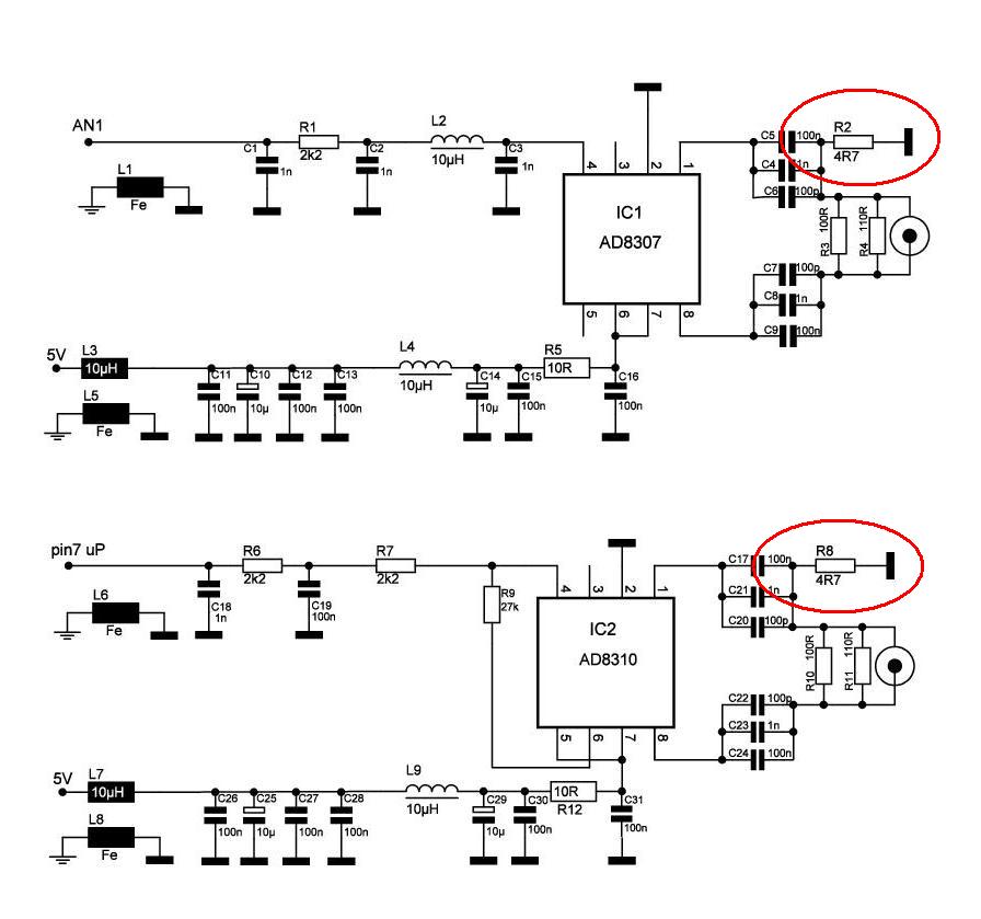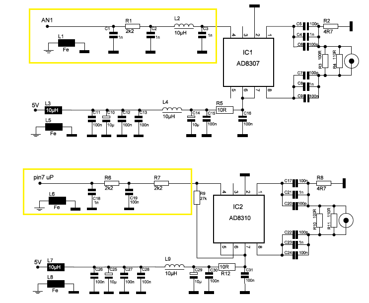 Wyjscie sygnalu z AD8307 mamy uzyte 3 x 1nF, rezystor 2.2k i dlawik 10uH.