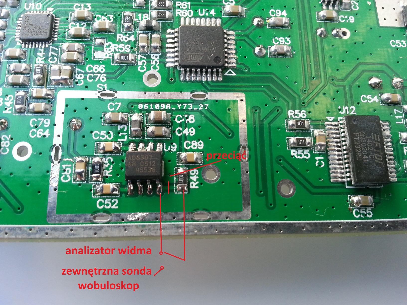 Za radą Kolegi SQ8AQX wywaliłem opcję analizatora widma i podpiąłem na wejście procesora zewnętrzną sondę na AD8307. Teraz działa to jak NWT w zakresie 35 - 500MHz. W celu uzyskania pełnego zakresu należy zbudować sondę logarytmiczną na układzie o wyższej częstotliwości granicznej. Do kalibracji używam tłumika zewnętrznego, jako że w tym urządzeniu brak tłumików takich jak w NWT.