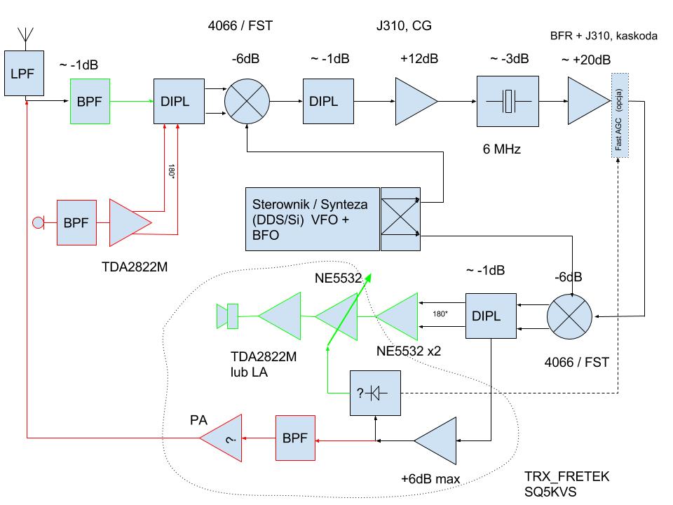 Ten wzmacniacz na JFET daje około 10-12dB wzmocnienia (~5x), co pokrywa z lekką nawiązką straty w pierwszym mieszaczu, diplekserze i reszcie. Jednocześnie ma na tyle małe wzmocnienie i nie jest krytyczny, że przy nadawaniu spokojnie "obsłuży" poziom sygnału rzędu kilkuset mV p-p.