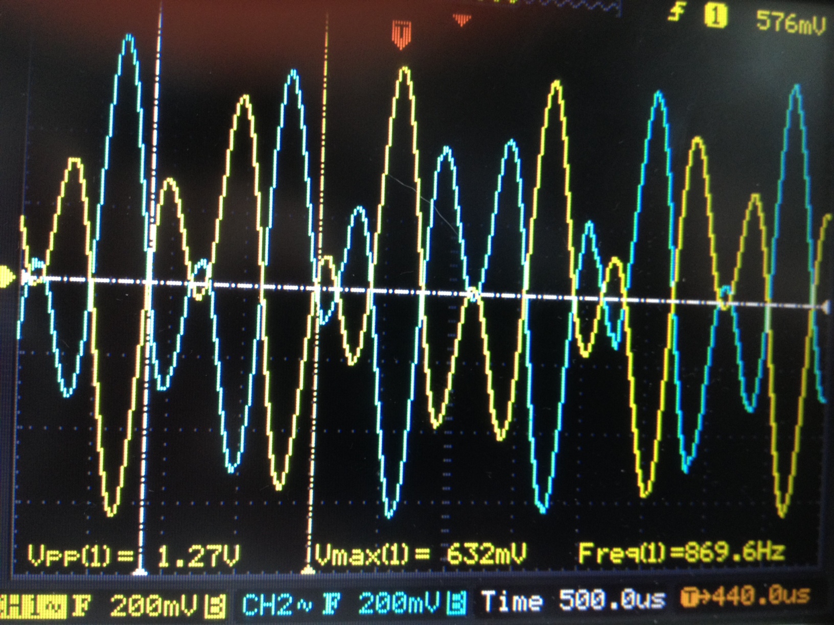 (tu trochę przesadziłem, ale widać że jest w przeciwfazie. Dwa tony - 800 i chyba 1800Hz).