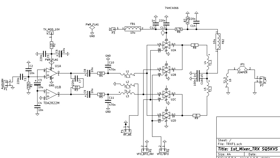 Jako mieszacza użyłem popularnego 74HC4066 czyli czterech kluczy CMOS przełączanych osobnymi sygnałami. Nic nie stoi na przeszkodzie aby użyć lepszych układów FST i innych. Żeby prawidłowo wysterować 74HC4066 trzeba mieć dwa sygnał VFO prostokątne - w fazie (do sterowania jedną parą kluczy) i przeciwfazie (do sterowania drugą).