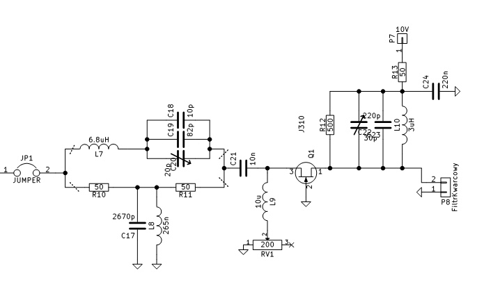 Niestety, nawet jakbyśmy mieli świetny diplekser, to impedancja filtrów kwarcowych w okolicach rezonansu zmienia się o wartości rzędu kilku tysięcy. Tak więc żaden diplekser nie da nam dobrego dopasowania w okolicach pasma przenoszenia naszego odbiornika - tu można stosować różne patenty - ja użyłem standardowego JFET'a J310 układzie z uziemioną bramką. Dla pewnych prądów tego tranzystora, impedancja tego układu widziana od strony źródła może wynosić 50 omów, czyli tyle ile trzeba. Po to też jest potencjometr RV1 - do ustalenia prądu. Jeśli układ będzie powtarzalny, będzie można tam dobrać na stałe rezystor.