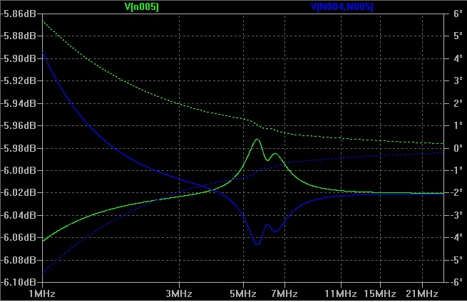 Poniżej symulacja odbicia takiego prostego dipleksera z nieidealnych elementów (ale dobrze zestrojonego Smile. Ideał jest kiedy obie kreski ciągłe mają poziom -6dB.