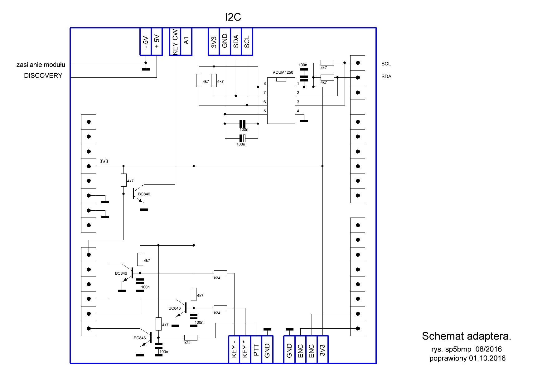 Przy wyjściu sygnałów z modułu STM czwarty pin od SCL tak w 4 jak i 5 wersji adaptera jest ignorowany jeżeli chodzi o połączenie, mimo że jest to ta sama masa co po przeciwnej stronie. Jaki jest powód nie łączenia mas w tym punkcie?