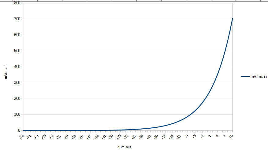 AD8307 w okolicach -70dBm ma nachylenie ok. 10uVrms wejściowego na 1dB, czyli 25mV wyjściowego - to daje współczynnik 2500!
