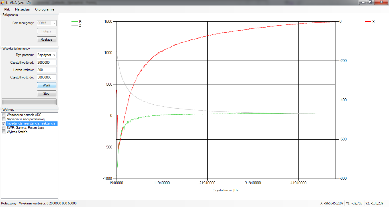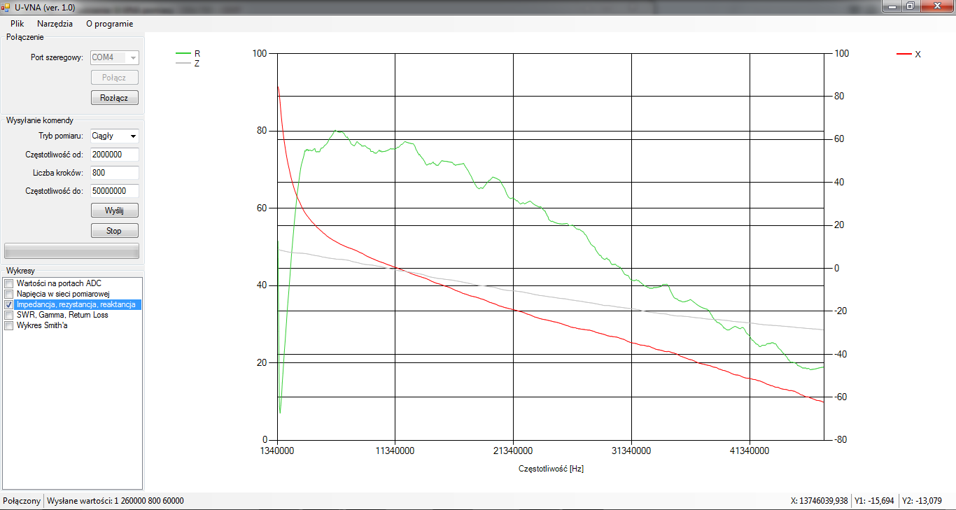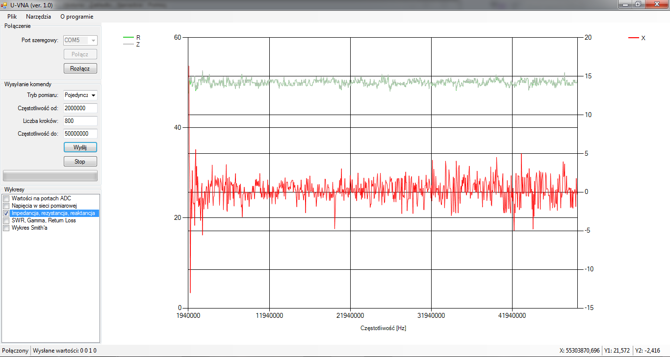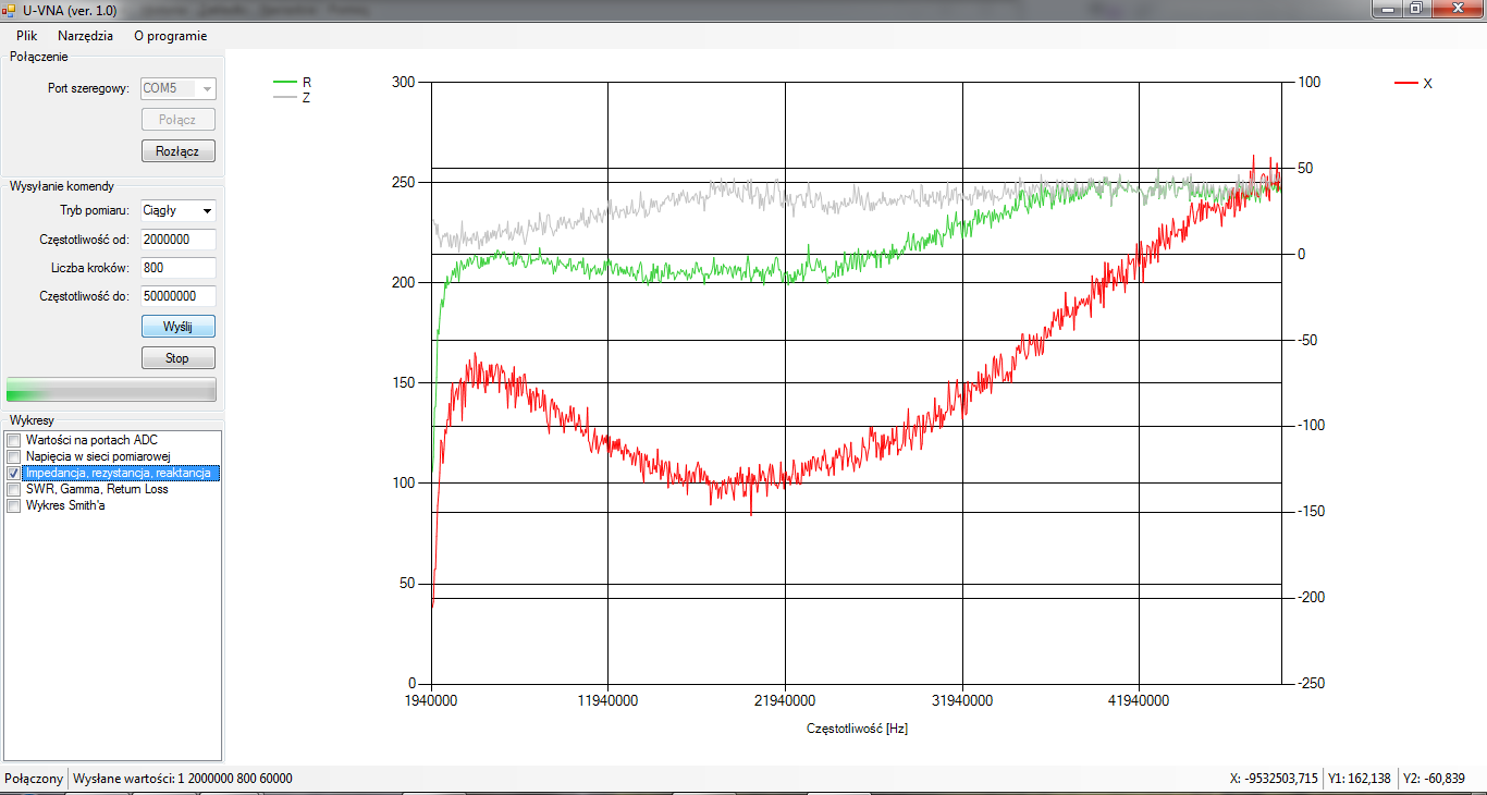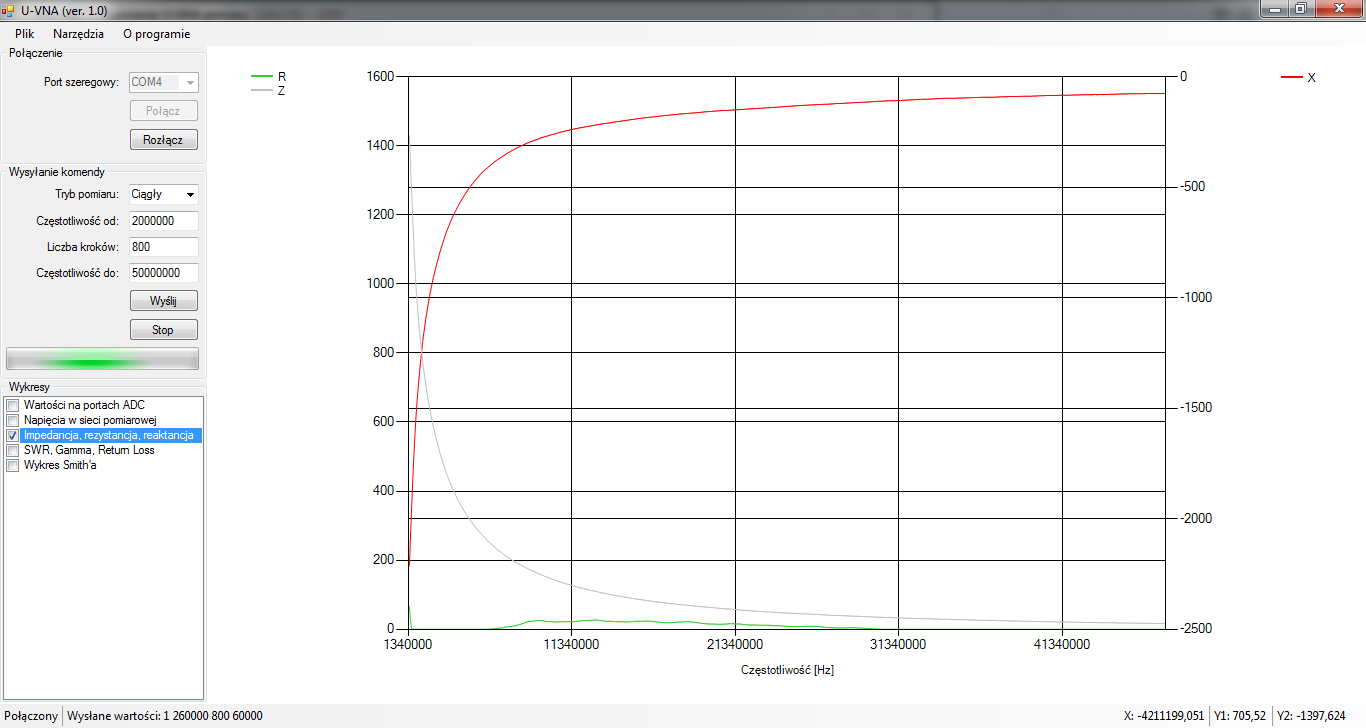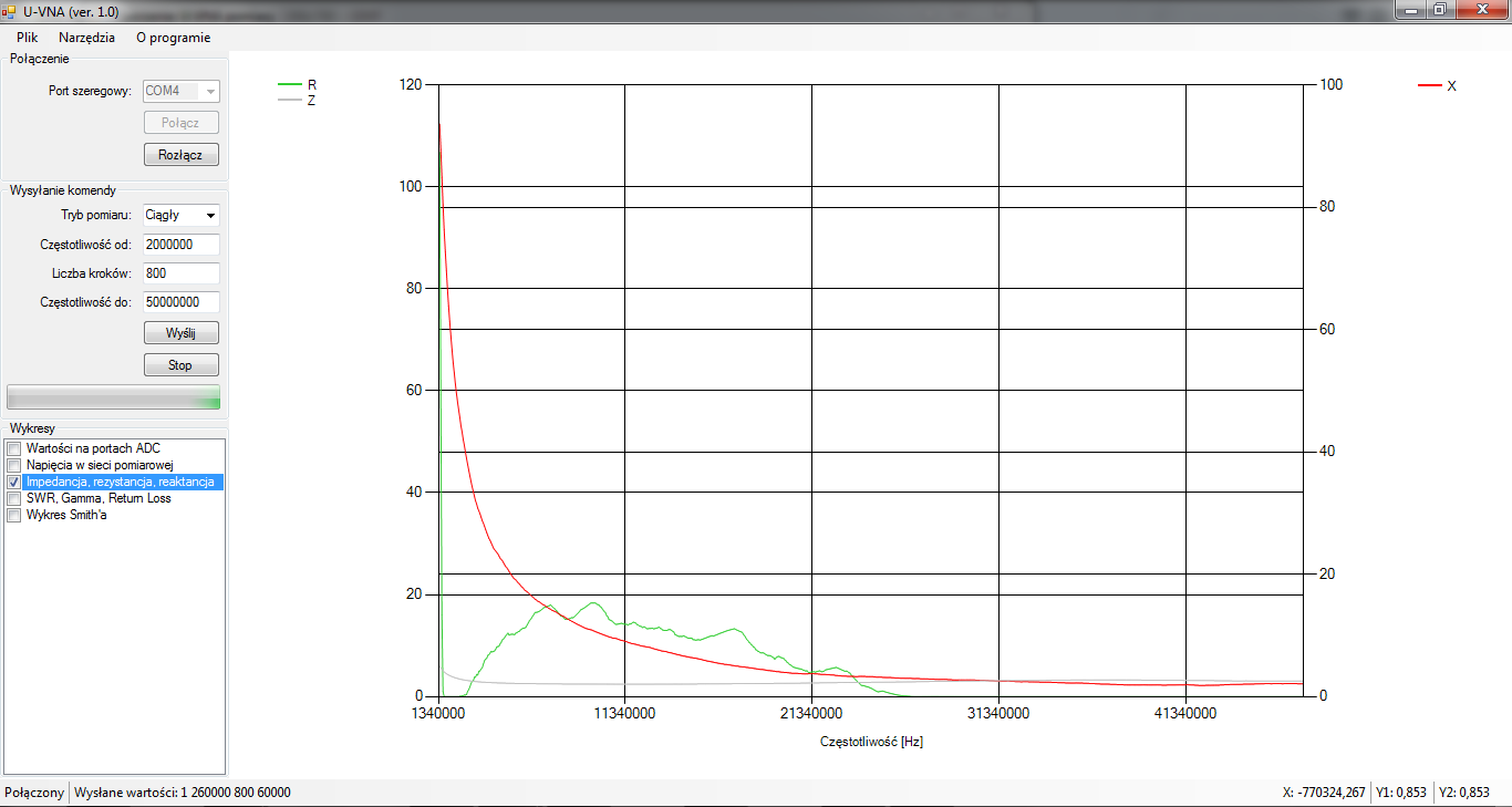 Widać, że wraz ze wzrostem częstotliwości maleje impedancja/reaktancja, co jest pewnie spowodowane pojemnością złącza wyjściowego.