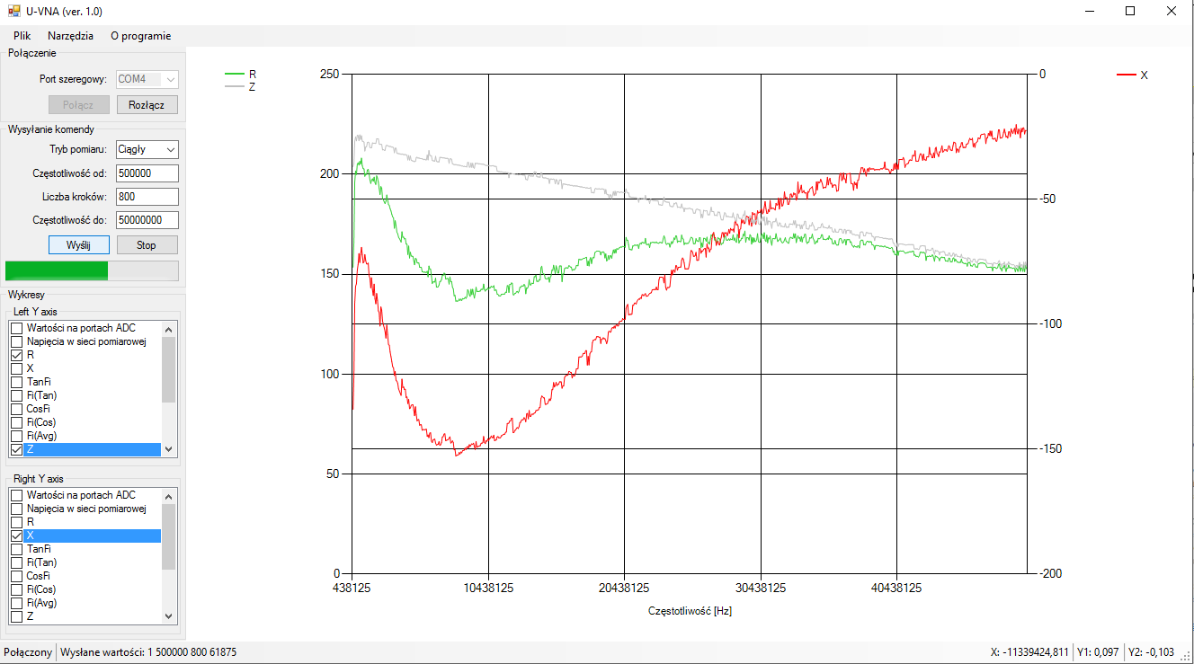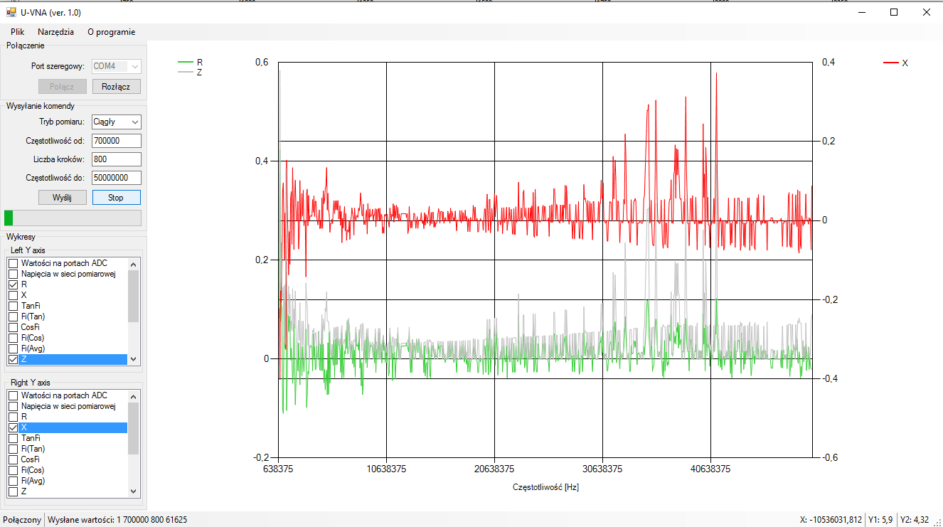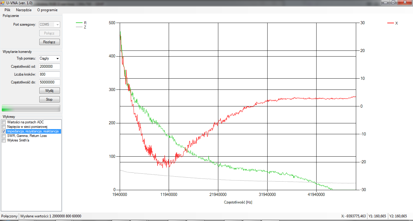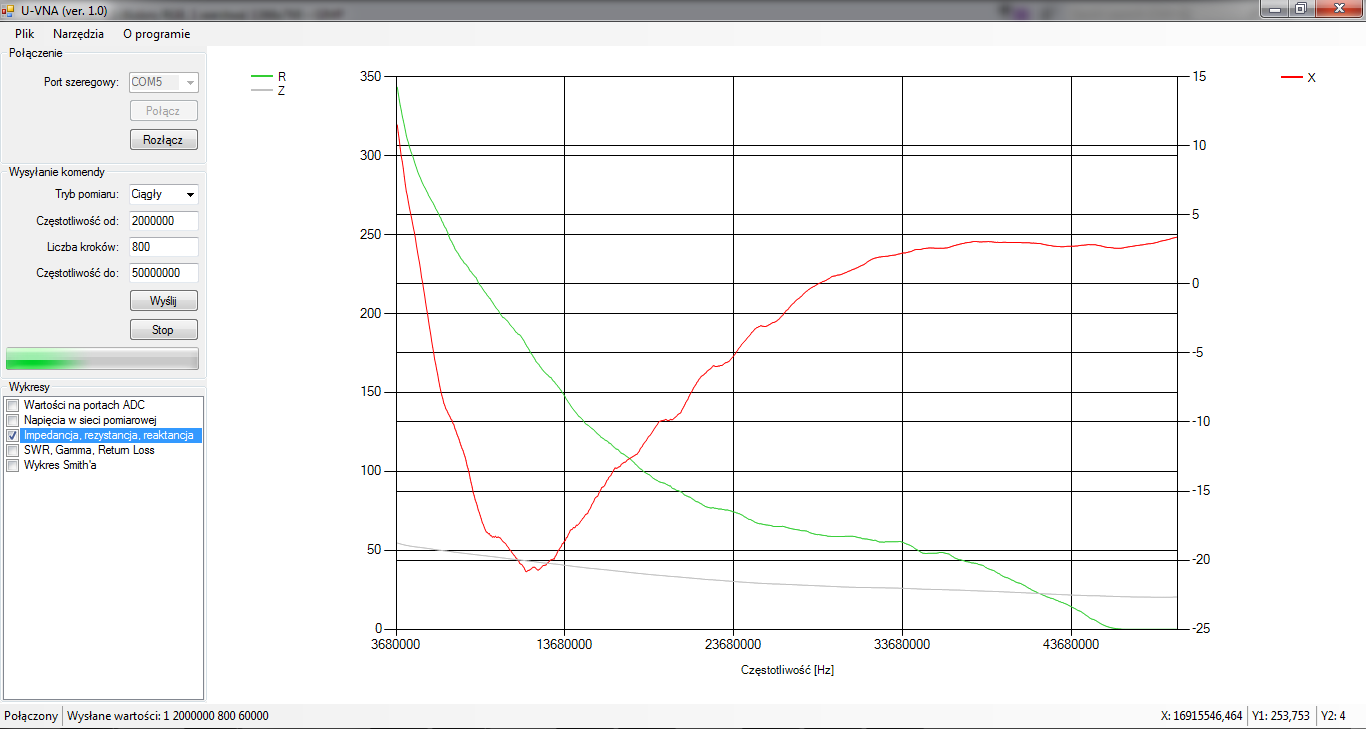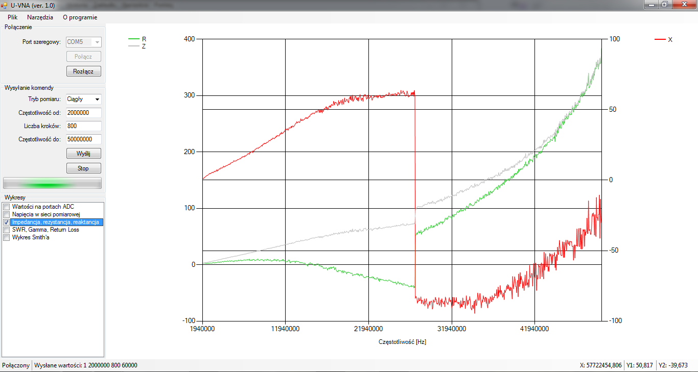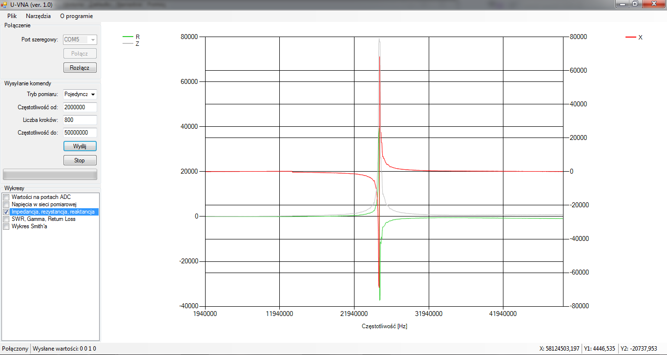 Widać, że wraz ze wzrostem częstotliwości maleje impedancja/reaktancja, co jest pewnie spowodowane pojemnością złącza wyjściowego.