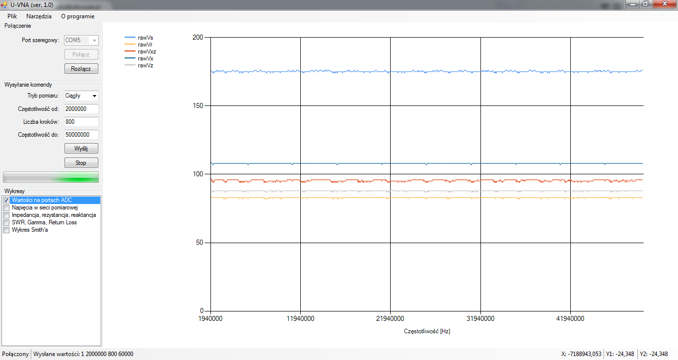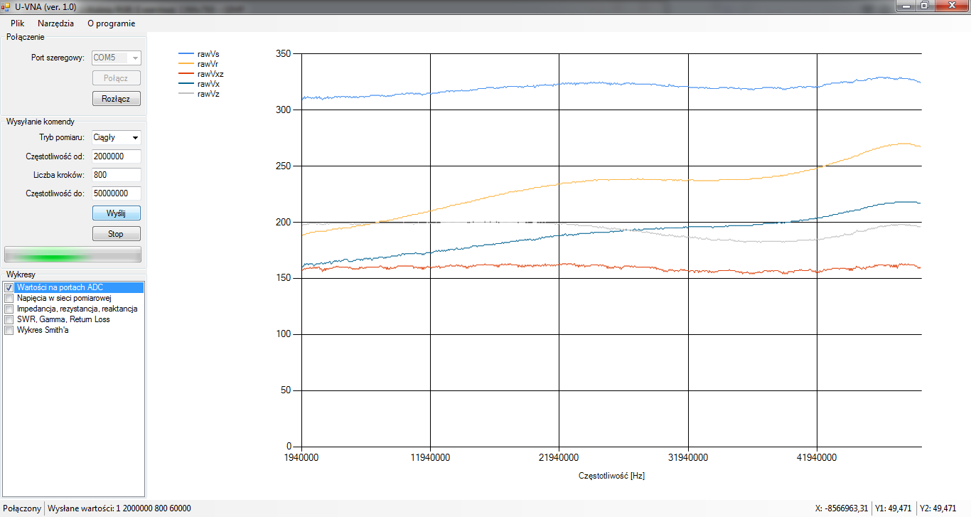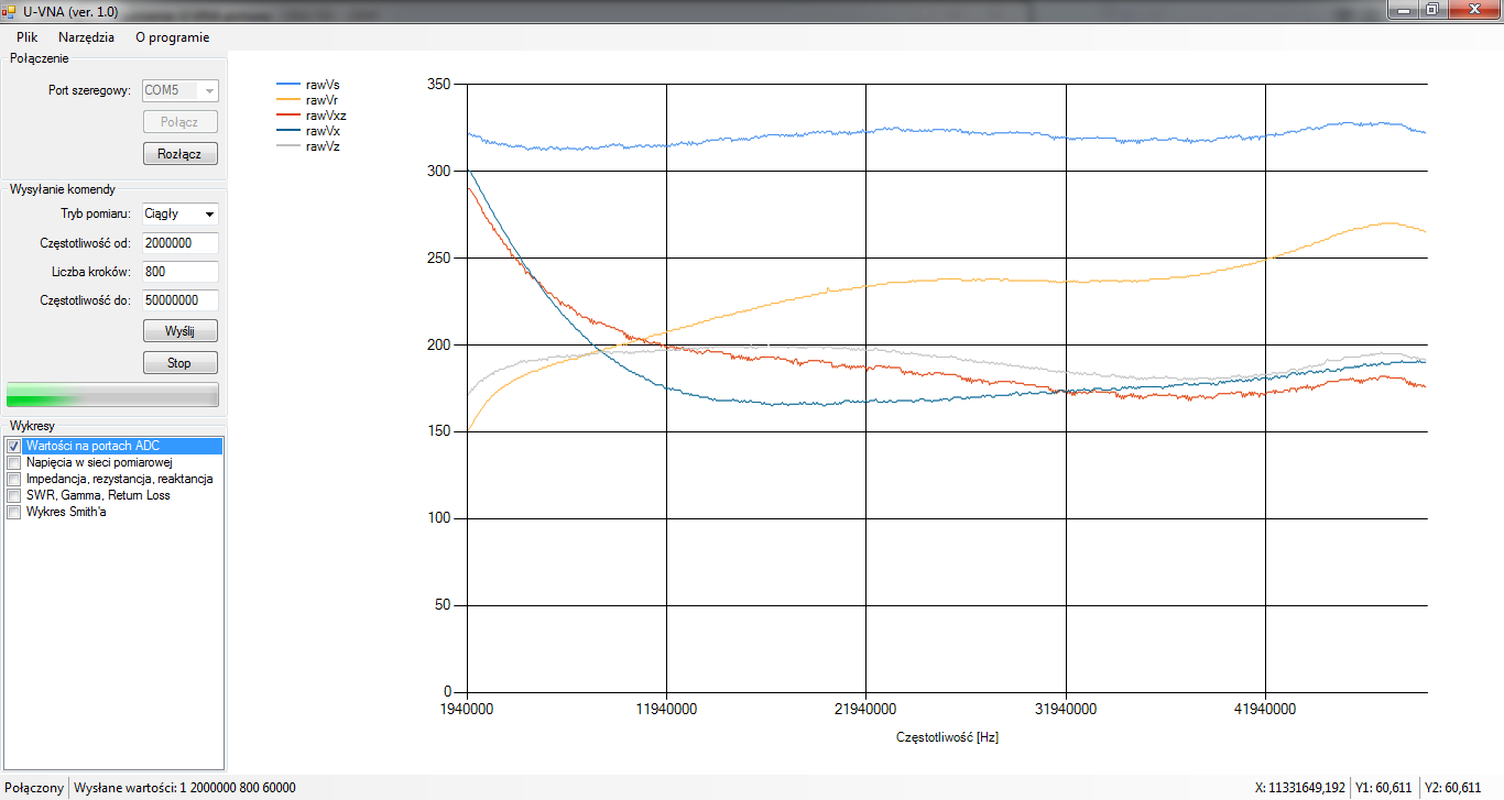 A tak wyglądają wartości na portach ADC po usunięciu zworki z reaktancji referencyjnej (pozostałe parametry niezmienione):