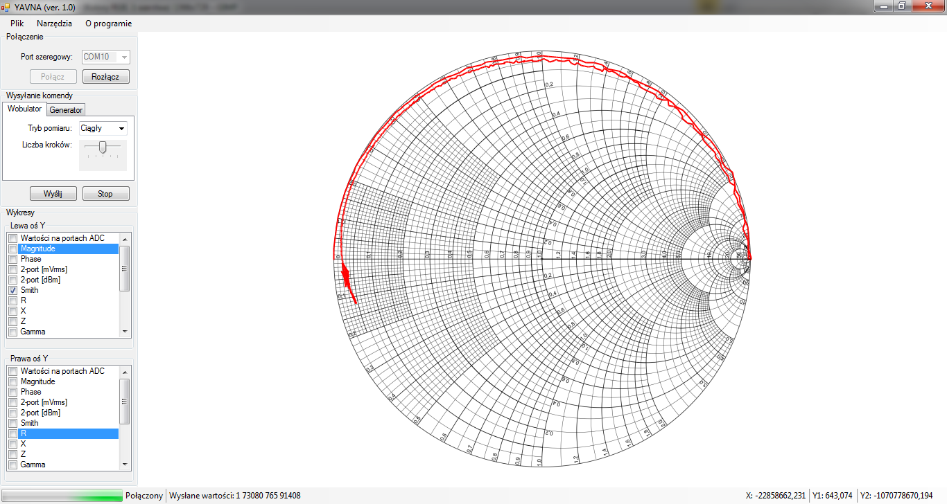 A tak wygląda wykres Smith'a dla obwodu LC. Jak widać wyłączyłem tymczasowo w oprogramowaniu procedurę rozpoznawania znaku reaktancji - muszę nad nią jeszcze popracować. Dlatego wykres nie schodzi na dolną część koła, ale widać jak ładnie "zawraca" ciągle trzymając się blisko krawędzi Smile
