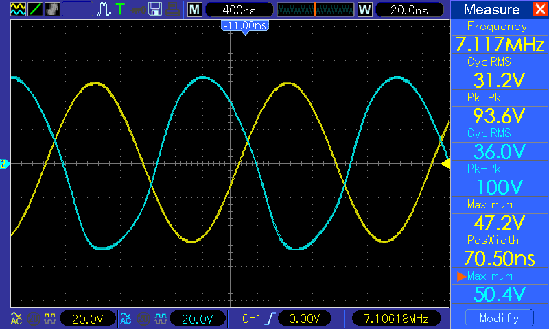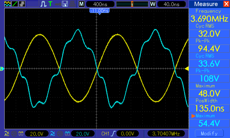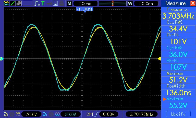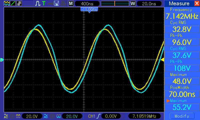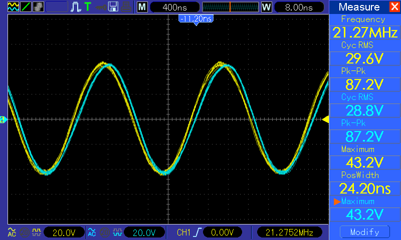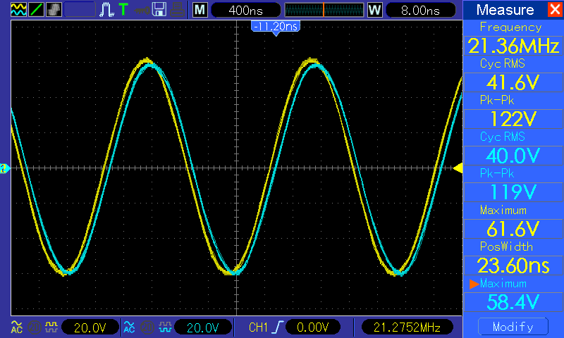 oscylogramy - żółty przebieg po LPF, niebieski po trafie wyjściowym.