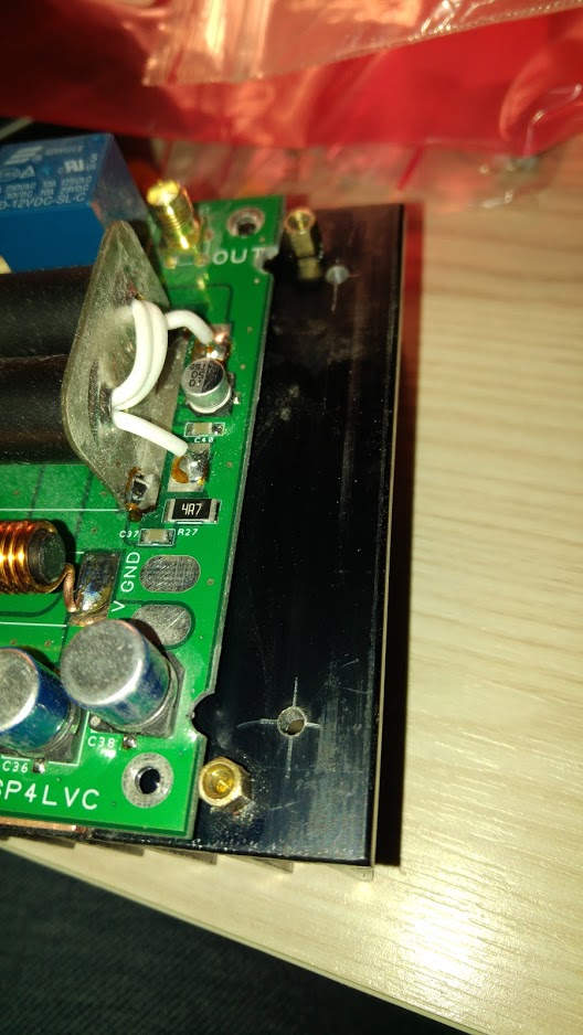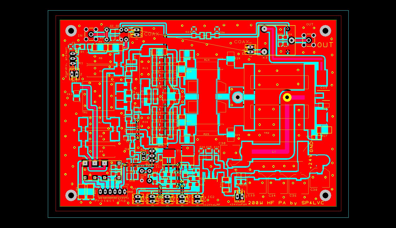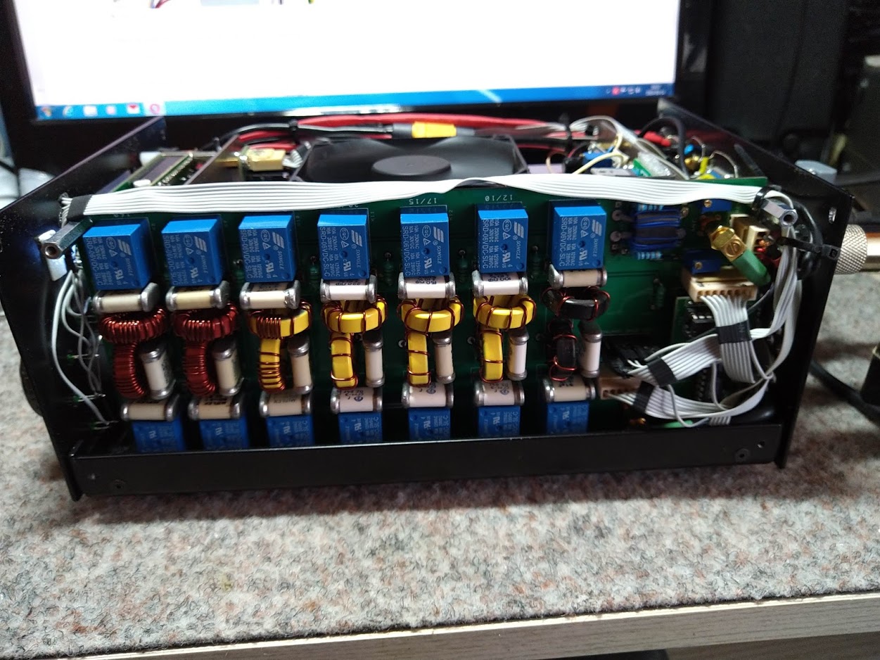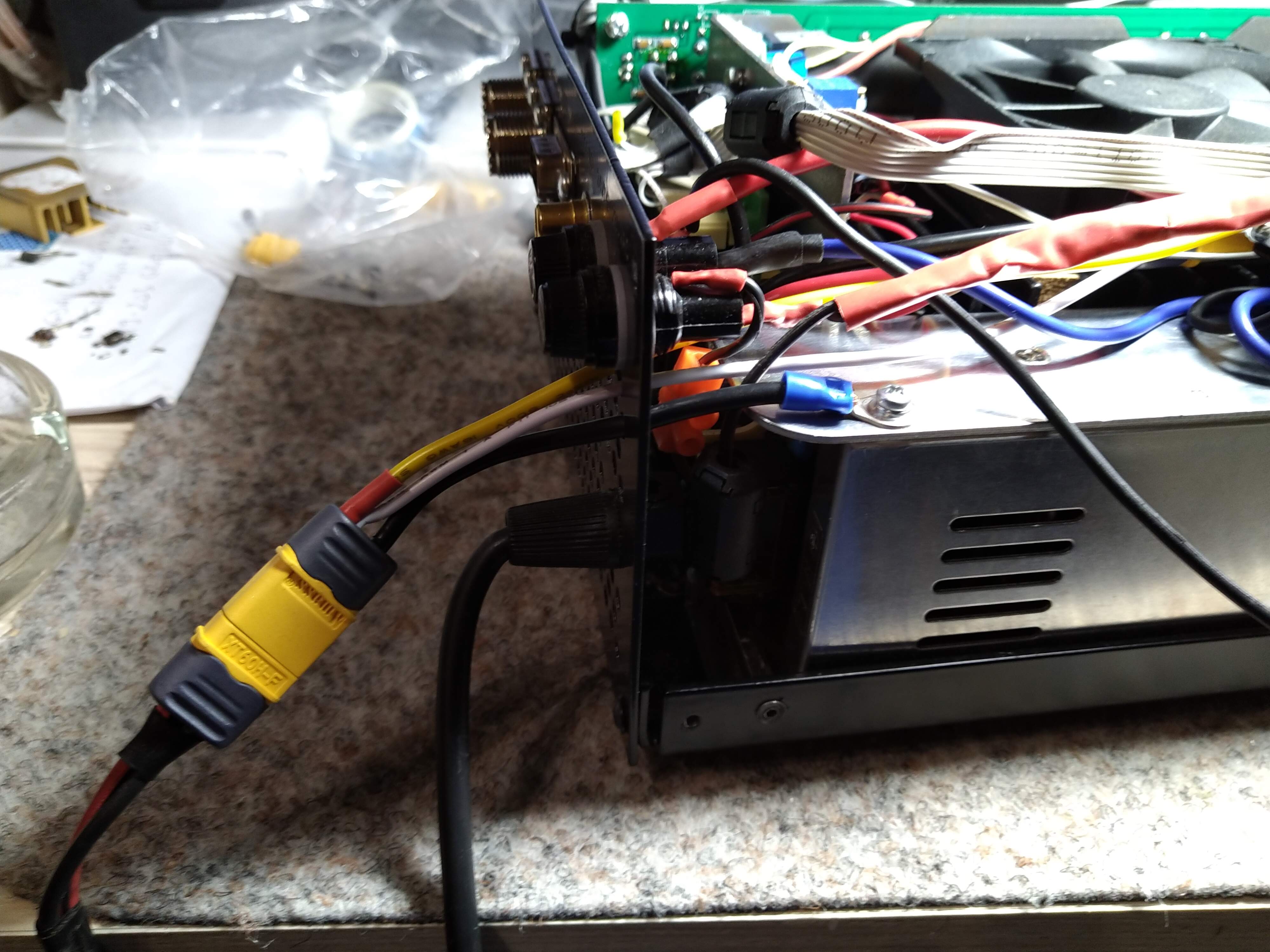 Reasumując myślę, że eksperymenty coś dały. Jeden z zasilaczy miałem odesłać, ale zostaną obydwa, bo każdy ma swoje wady, ale i zalety. Najbardziej ,,sztywny" pod względem napięcia okazuje się nasz zasilacz wewnętrzny. Ma swoje wady: mocne (co 85 kHz) prążki na 1,8 MHz, słychać go - bo wiatrak chodzi cały czas oraz często działa jego zabezpieczenie nadprądowe jak przeholujemy z mocą sterującą z Husarka i tym samym z poborem prądu. Ale jest! - siedzi w środku i spełnia swoje zadanie. Jeżeli pogodzimy się mocnymi prążkami na 1,8 MHz (wiem, że większość kolegów i tak nie używa tego pasma - choćby z braku anten) i słyszalnym wentylatorem to on w zupełności wystarczy. Zresztą przy standardowo ustawionym głośniku Husarka przy odbiorze odgłos wentylatora zdaje się już jakby niesłyszalny. W każdym razie mamy pudełko, które łapiemy pod pachę, np. na wyjazd i spełnia ono swoje zadanie. Jeżeli chcemy czegoś więcej to w zapasie mamy opcję na podłączenie zewnętrznego zasilacza. Do wszystkich połączeń prądowych zastosowałem kabel 2,5 mm kw. oraz złącza XT60, które według producenta wytrzymują prąd w okolicach 60 A. Na nogach przekaźnika zaciśnięte na przewodach i mocno wciśnięte na konektory przekaźnika wsuwki damskie. Na razie gniazdo zasilania zewnętrznego ,,dynda" na przewodach, ale nie jest wykluczone, że zostanie na nie przewidziane miejsce na tylnej płycie i będzie tam przykręcone. Zastanawia mnie tylko to, że uzyskuję maksymalnie 18 A poboru prądu i nie mogę tej wartości przekroczyć. Może jakieś mikrooporności na stykach przekaźnika - trudno powiedzieć. Teoretycznie możnaby zwiększać moc sterującą, by zmusić wzmacniacz do większego poboru prądu, ale w sumie to i tak już zbliżamy się do granicy wydajności zasilaczy zewnętrznych. Myślę, że nie ma sensu śrubować tych mocy, bo można pomimo zabezpieczeń przekroczyć ,,cienką czerwoną linię". Ja na razie nie chcę przeginać, bo chyba nie warto. 50 W więcej mocy ze wzmacniacza nie zauważy na S-metrze chyba żaden z korespondentów. Na koniec chcę przypomnieć o zastosowanym sposobie pomiaru mocy odbitej. Przy podniesionej mocy wyjściowej (FWD) wzrośnie nam również wskazanie SWR (REV). Te wartości jak wiemy idą w parze. Dlatego PR-kiem R3 na płycie LPF (dolny otwór w prawej bocznej ścianie obudowy) należy ustawić dla maksymalnej mocy wzmacniacza realne wskazania SWR anteny na danej częstotliwości lub zrobić tę korektę na sztucznym obciążeniu. W załączniku schemat i zdjęcia z moich nowych prac ręcznych.