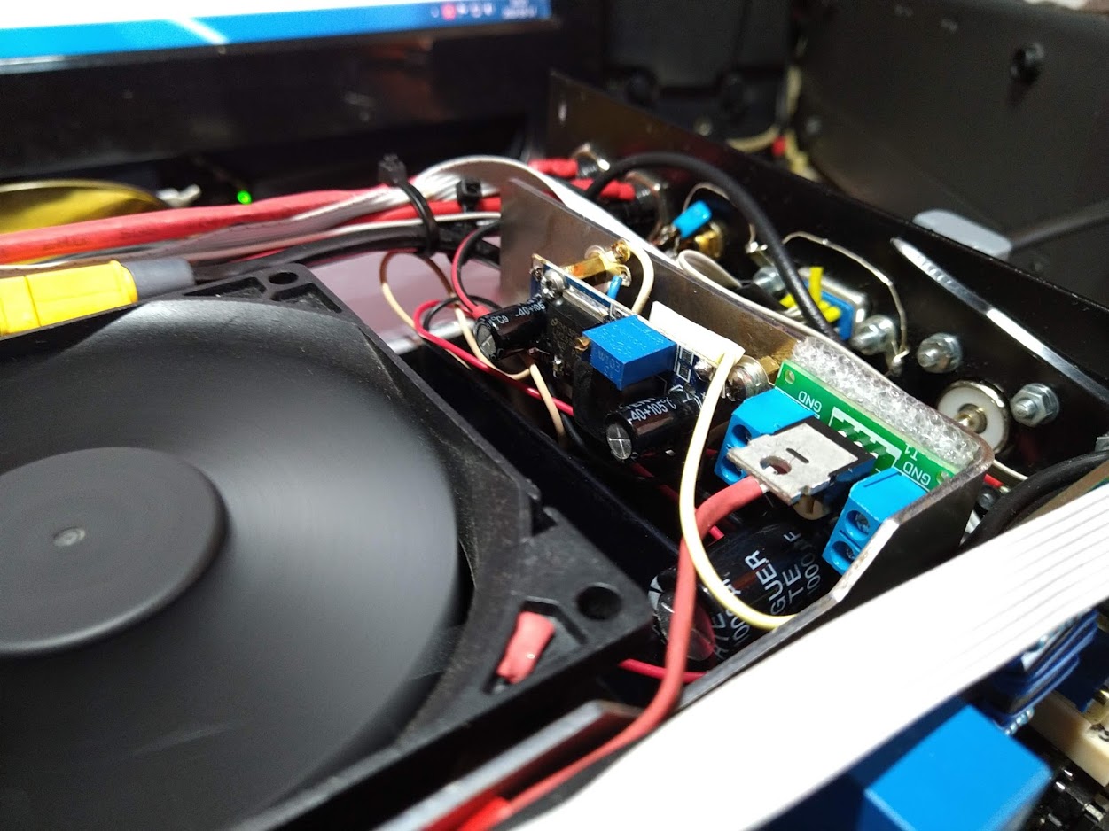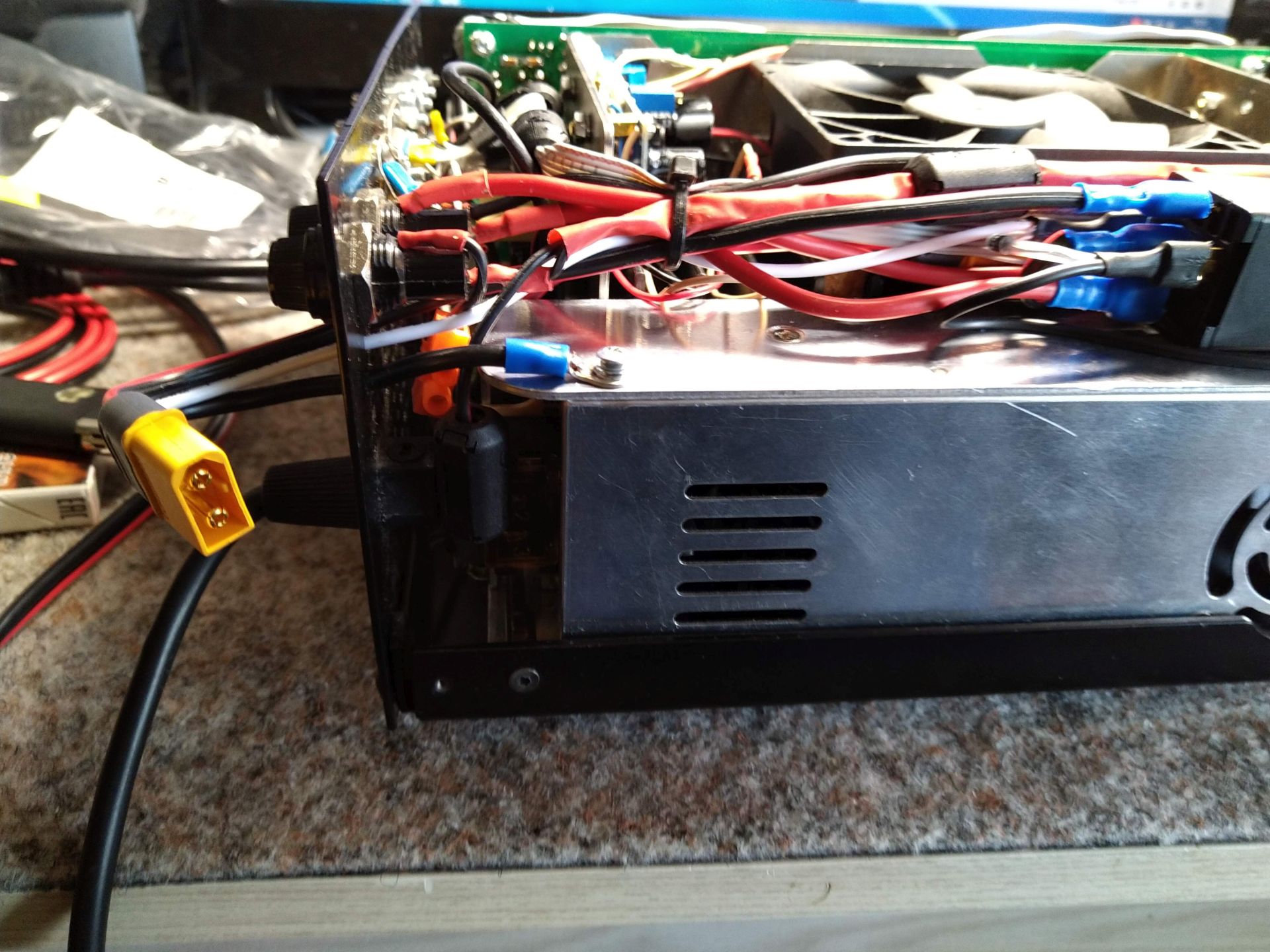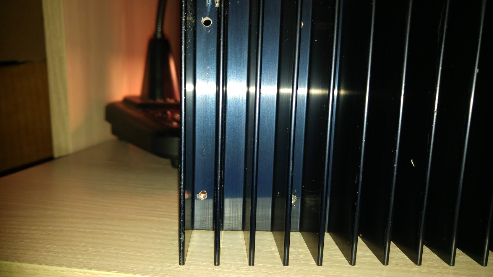 W paśmie 1,8 MHz efekty pracy zasilacza są słyszalne co ok. 60 kHz, ale na poziomie większym tylko o 1S od tła pasma. Zasilacz ten jest niestety mało sztywny napięciowo. Pomimo tego, że ma deklarowaną moc prawie 500W przy wysterowaniu i poborze prądu 16 A napięcie na nim spada z 25,4 V do 22,8 V, a więc prawie o 2,5 V. Moc output ze wzmacniacza dochodzi do 220 W w paśmie 3,5 MHz. Tak więc nie ma szału mocowo, ale za to przy jego używaniu da się bez większej biedy pracować w paśmie 1,8 MHz - prążki są naprawdę minimalne. Wentylator jest chyba mniej słyszalny od wentylatora zasilacza wewnętrznego, pomimo tego, że ten zewnętrzny stoi na zewnątrz. Zasilacz nie ma możliwości regulacji napięcia wyjściowego.