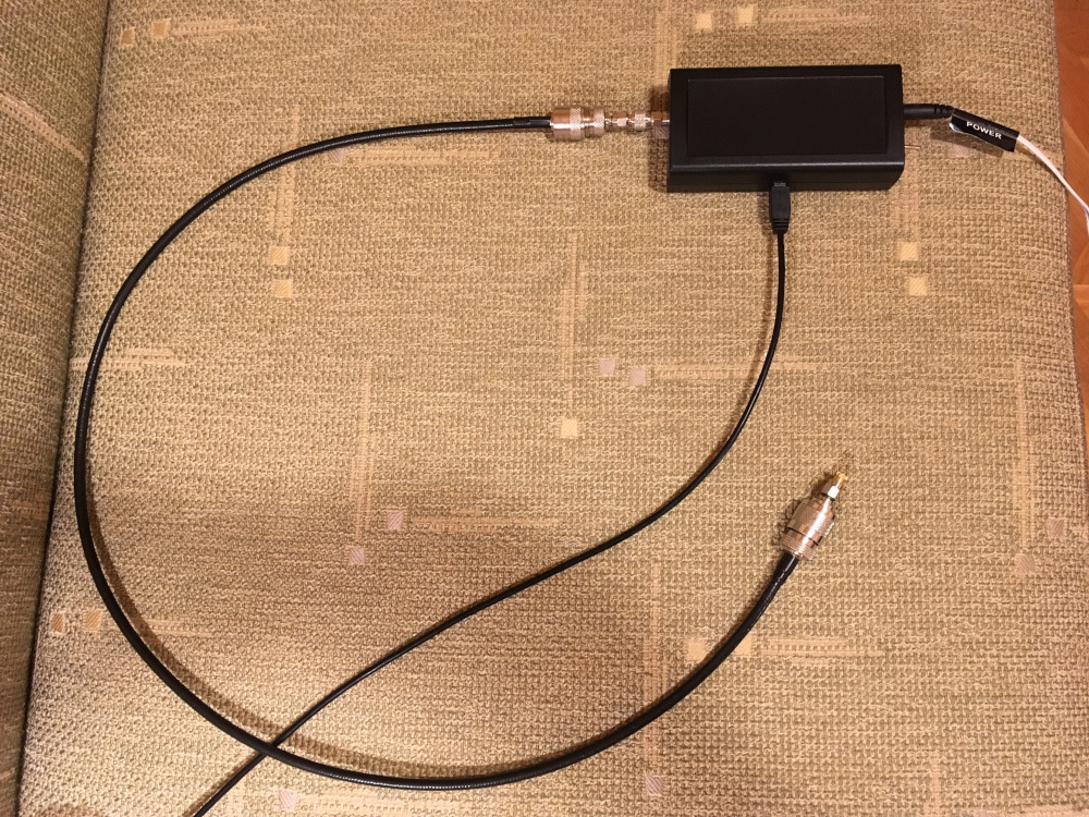 Ponieważ to urządzenie prawidłowo "odczytuje" znak mierzonej reaktancji, możliwe są pomiary przez dowolnie długie kable (oczywiście 50-omowe koncentryki). Dlatego wszystkie pomiary, które prezentuję poniżej, zrobiłem przez taki oto kabel (długości mniej więcej jednego metra), który na końcach ma jeszcze odpowiednie przejściówki między złączami SMA, UC i N (takie trochę "dziwadło", bo akurat taki kabel miałem pod ręką, ale to też pokazuje, że konfiguracja przewodów nie ma za bardzo wpływu na pomiary, pod warunkiem oczywiście, że kalibrację wykonujemy na końcu takiego kabla):