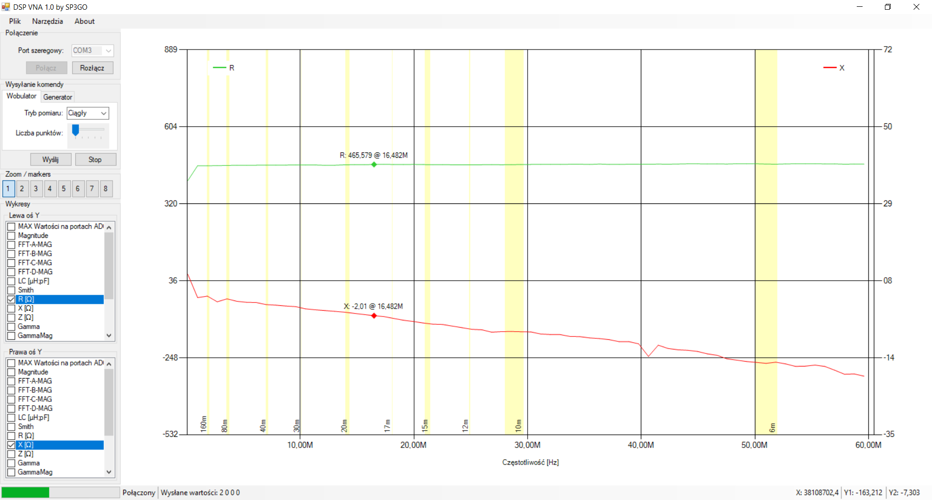 Podobnie jak poprzednio, pokazuję pomiary rezystancji (skala na lewej osi) oraz reaktancji (skala na prawej osi).