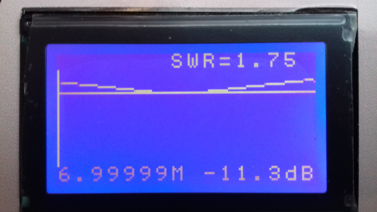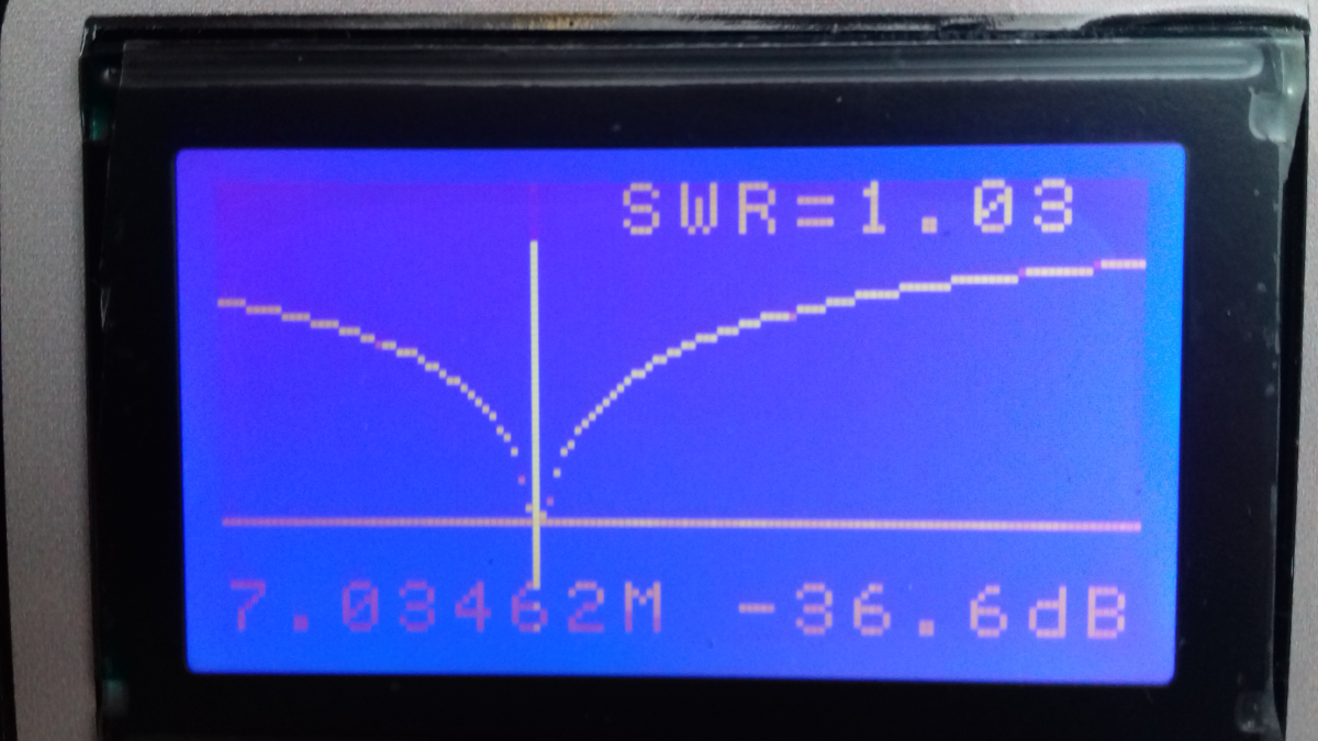 Dodatkowo, strojenie anteny zmienia się dramatycznie w zależności od miejsca gdzie ona stoi. Ustawiona na zewnątrz ma silny, wąski rezonans i SWR bliski 1 a w mieszkaniu rezonans jest bardzo szeroki a SWR mocno wzrasta.
