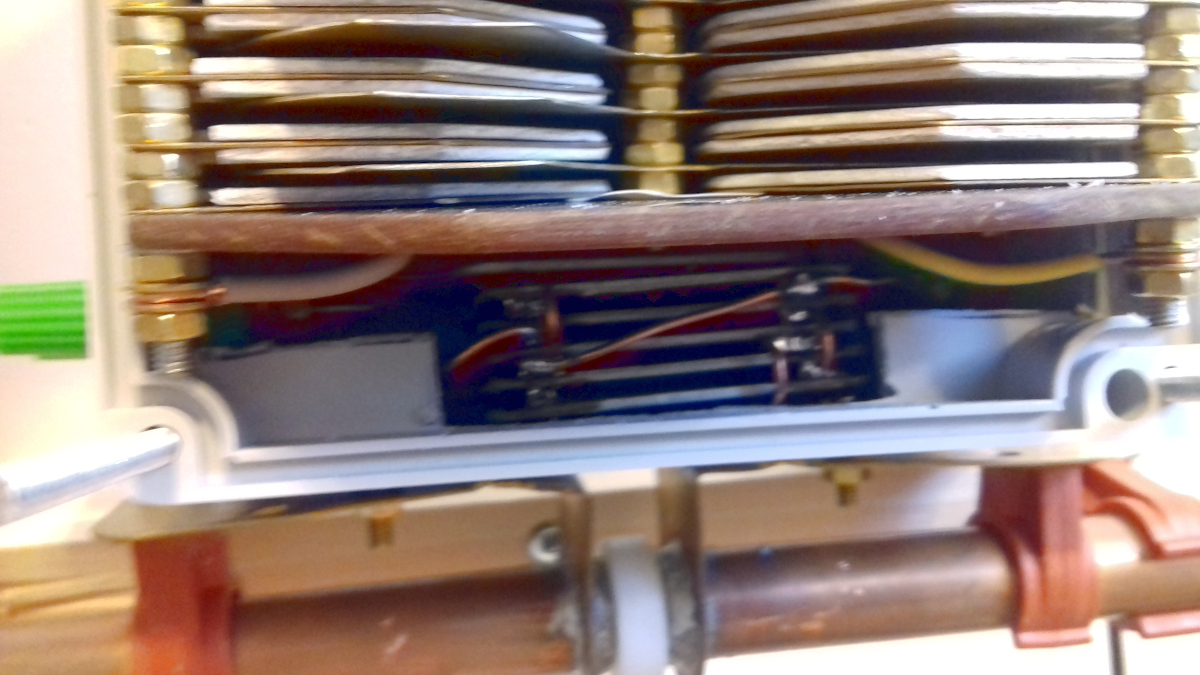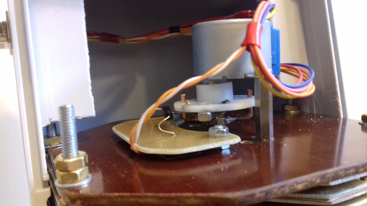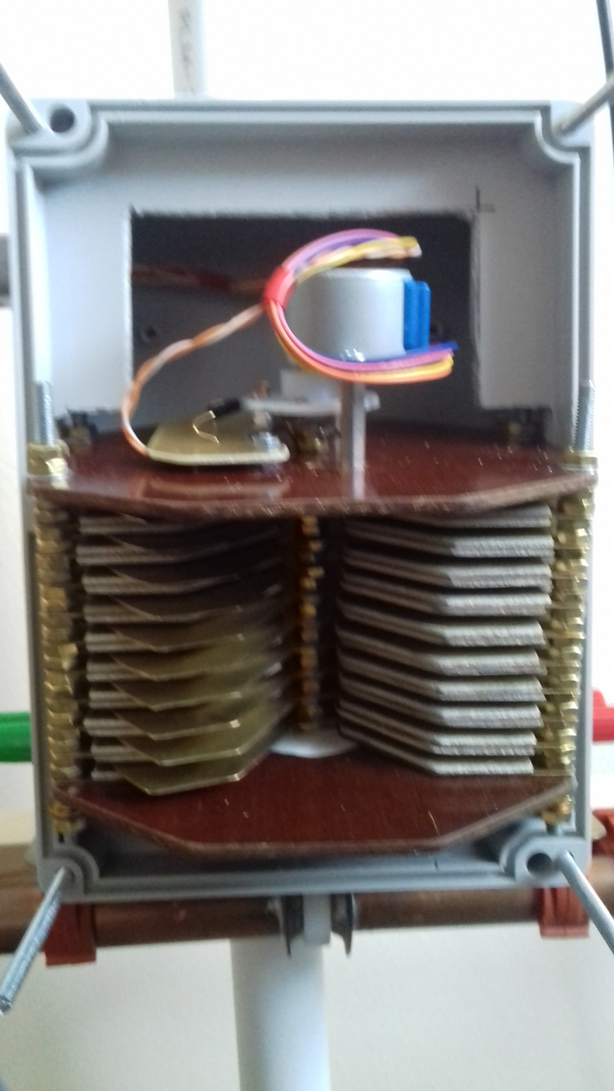 Na zdjęciach wnętrze skrzynki z kondensatorem zmiennym i silnikiem sterującym nim (sinik krokowy), zbliżenie na sprzęgło gdzie widać kontaktronowy czujnik położenia kondensatora oraz magnes na kole sprzęgła (białe koło z teflonu) oraz zbliżenie na kondensator.