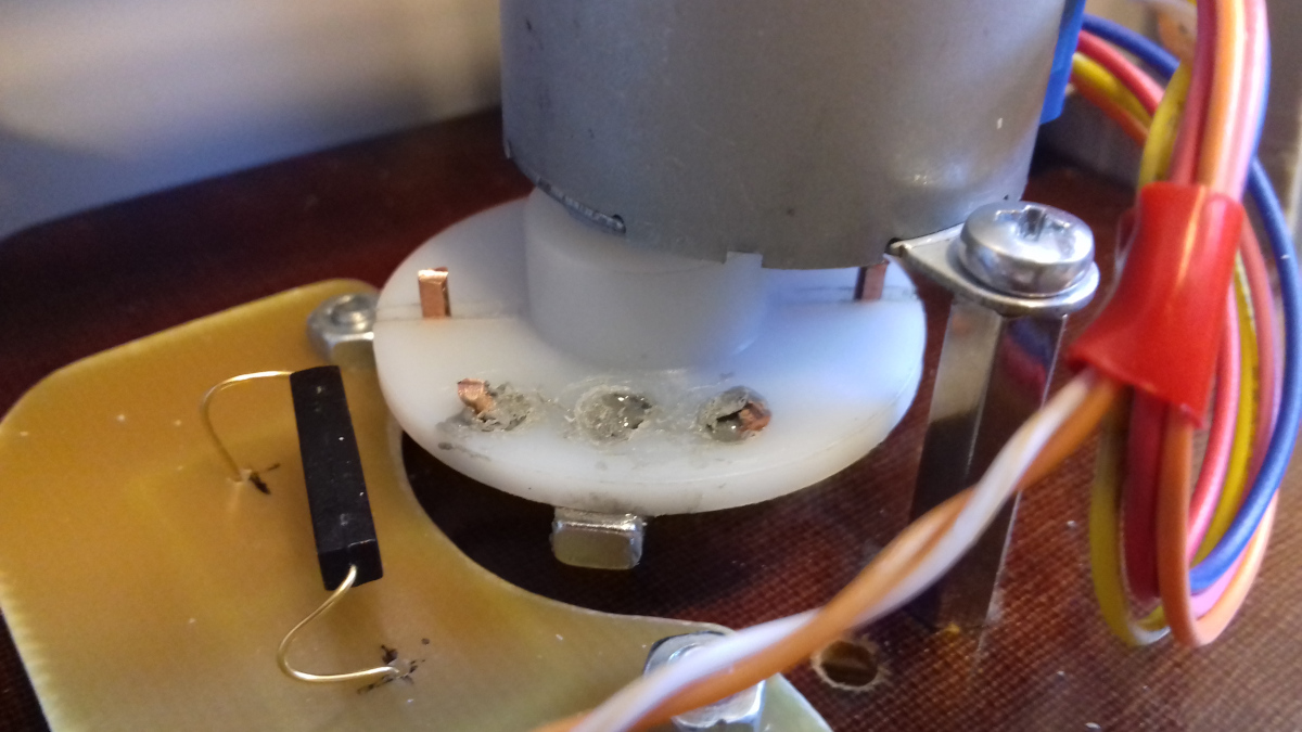 A przy okazji załączam kilka zdjęć sprzęgła między silnikiem a osią kondensatora. Sprzęgło to kółeczko teflonowe założone na oś silnika krokowego z przekładnią, które na swojej szerszej części ma dwa wycięcia o szerokości ok. 1.5mm. W te wycięcia wchodzą kły sprzęgła - drut miedziany #1.5mm nalutowany na oś kondensatora zmiennego. W ten sposób mam zapewnioną, z,jednej strony izolację galwaniczną sterowania od anteny a z drugiej strony nie muszę się martwić o idealną osiowość sinika i kondensatora bo kły mogą przesuwać się w wycięciach. Na zdjęciach widać poza tym na kole sprzęgła również magnesik (mocowany do koła również drutem miedzianym) oraz kontaktron. Te ostatnie dwa elementy mają zapewnić jednoznaczność strojenia w procedurach zautomatyzowanych.