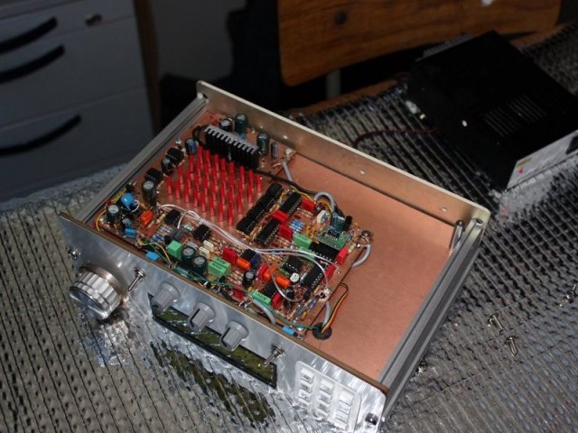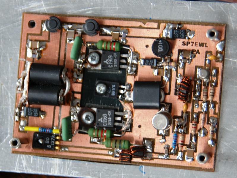 Płytka ma zmodyfikowany wzmacniacz m.cz na LM386 i dodany jeden stopień TL072. Wykonałem płytkę termotransferem ale to jest prawdziwa "masakra". Wiercenie i frezowanie zajmuje pół dnia a efekt mizerny. Taka płytka w firmie wyjdzie około 50zł i moim zdaniem warto bo efekt widać na Waldka module. Na zdjęciu jest też fajny moduł filtrów dolnoprzepustowych z mostkiem SWR. Waldemar wykonał kawał dobrej roboty!