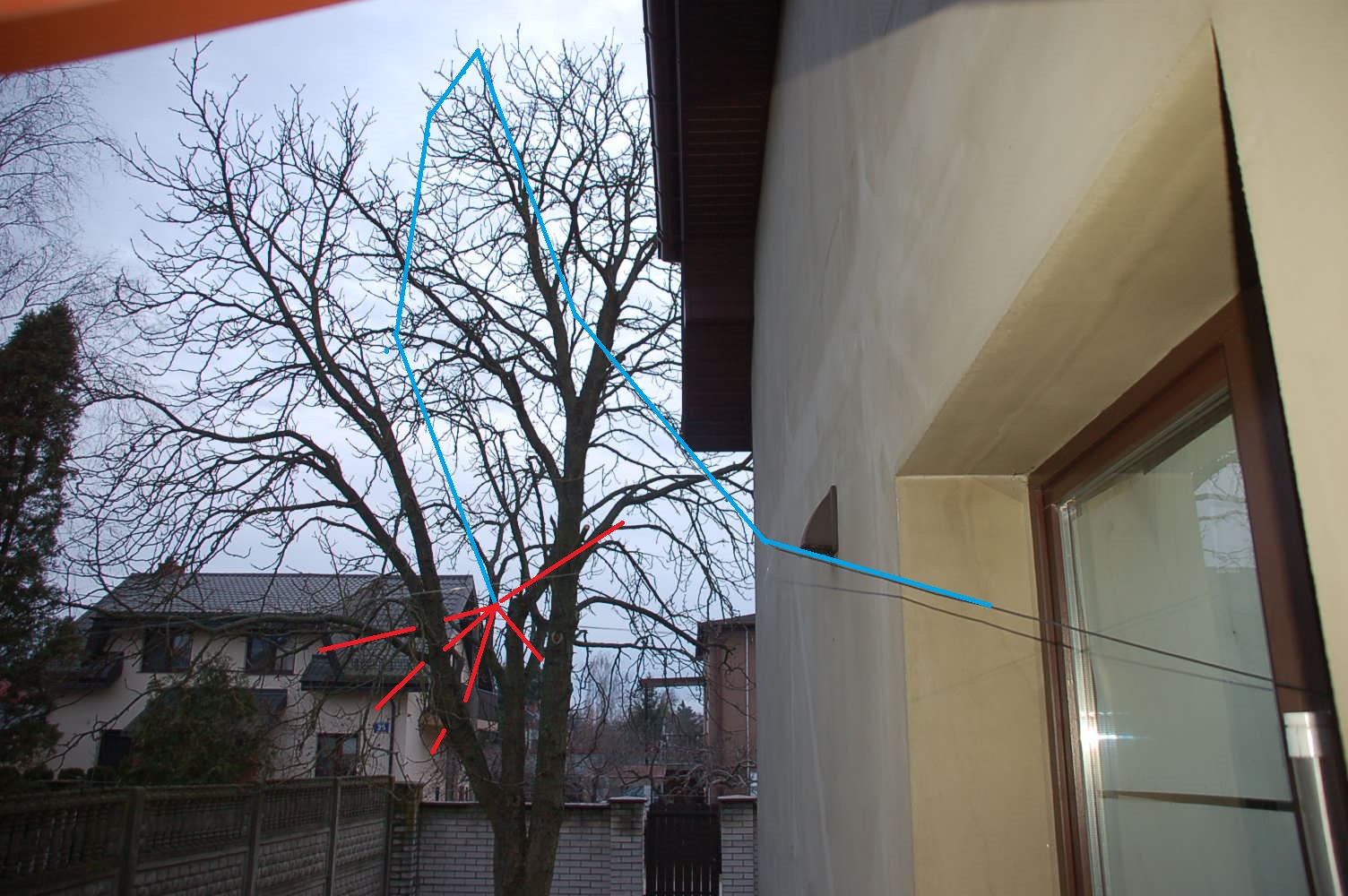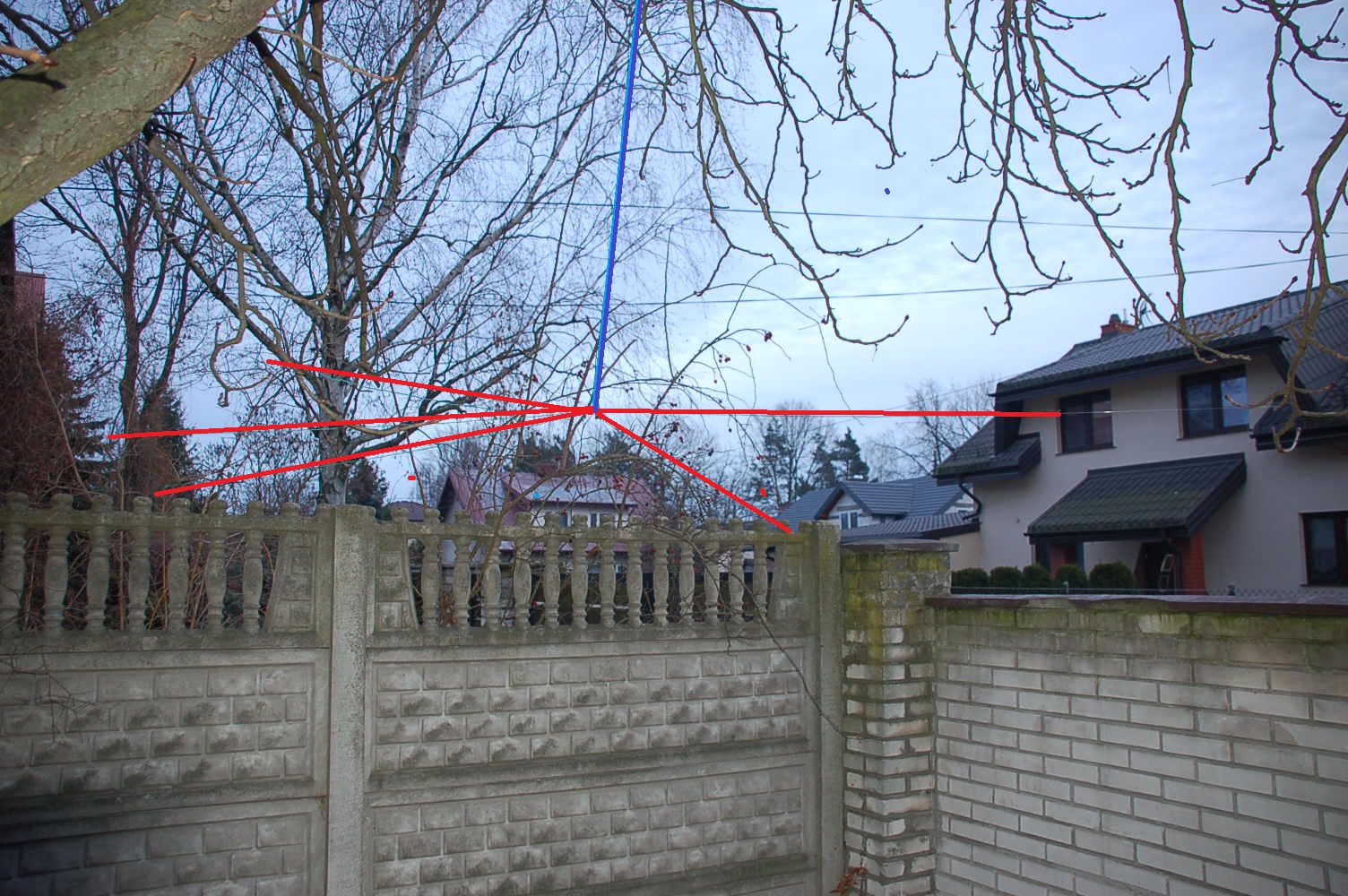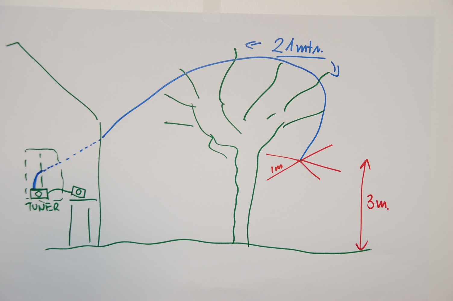 CZYLI 21 mtr. linki na kasztan obok budynku za pomocą procy i ciężarka ołowianego. Widoczność taka że jak nie wiesz że tam jest, to nie zauważysz. Antena radiowo kiepska Na 3,5 Europa Na 7 też a na 14 słaba Europa. 21 i 28 cisza.