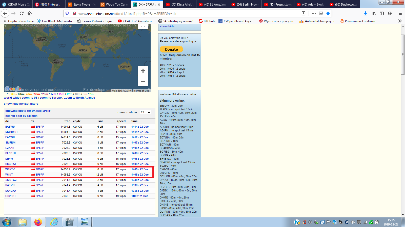 Antena zaczęła się stroić inaczej i na 14 na REVERSE BEACON NETWORK sprawdziłem zasięgi 14 MHz 100w wyszły 3 stacje - 3 w USA !! sprawdziłem za godzinę i wyszło 5! 4 w USA i 1 (po raz pierwszy!) w Kanadzie Dzisiaj potitałem na 3,5 i wyszła gęsto Europa i USA W1NT z New Hampshire. Żadna sensacja ale chyba nigdy nie dowołałem się do SDR-a w USA na 3,5MHz. a miałem epickie anteny 80 mtr. LW, Delty, Windomy....