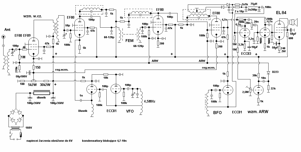 - pierwszą lampą byłaby pentoda ECF stanowiąca wzmacniacz w.cz. i mieszacz jednocześnie. Trioda tej lampy byłaby hetrodyną. Kondensator strojeniowy byłby 2 sekcyjny, jeden na wejściu a drugi w heterodynie. Obciążeniem mieszacza byłby dławik szerokopasmowy a anoda połączona z filtrem przez pojemność i obwód rezonansowy jak jest obecnie.
