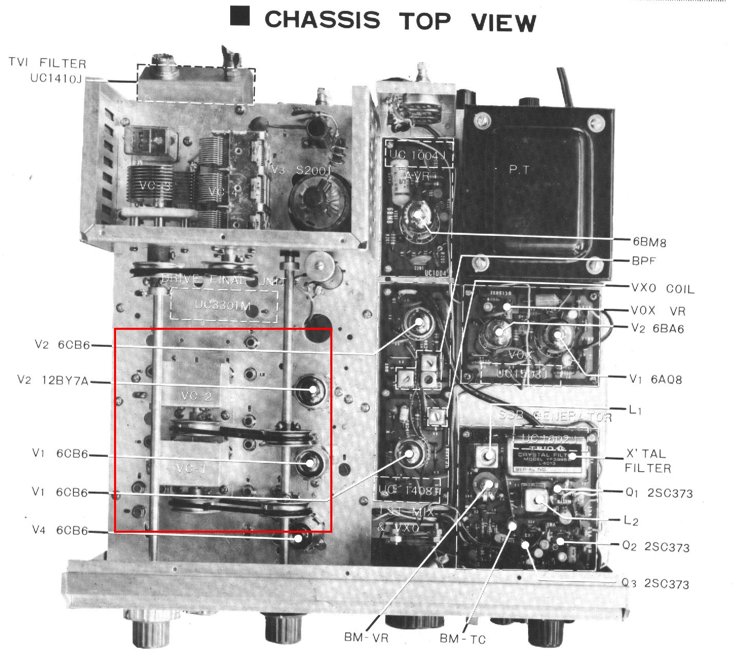 - kondensator zmienny w s1 wzm. w. cz. i w s1 mieszacza powinny byc na wspólnej osi (tzn podwójny agregat niezbyt wielkiej pojemnosci - wystarczy max 50 pF . W przypadku zastoswoania wiekszego wskazane byłoby w szereg z każda sekcja dać kondensator stały 100-200pF (w zaleznosci jak duża pojemnośc maksymalna bedzia mial zastoswoany kondensator zmienny). Wyprowadzenie tego kondensatora na płyte czołową mozna zrealizowac za pomoca przekladni linkowej jak na zdjeciu z TX-310. Na zdjeciu widac dwie sekcje kondensatora zamkniete w metalowych pudelkach i dwie przekladnie paskowe do osi dostrajania drivera. Tak samo należy rozwiazać strojenienie wejscia odbiornika i tak jest rozwiazane w transciverach gdzie obwody wejsciowe rx sa jednoczesnie obwodami drivera nadajnika.