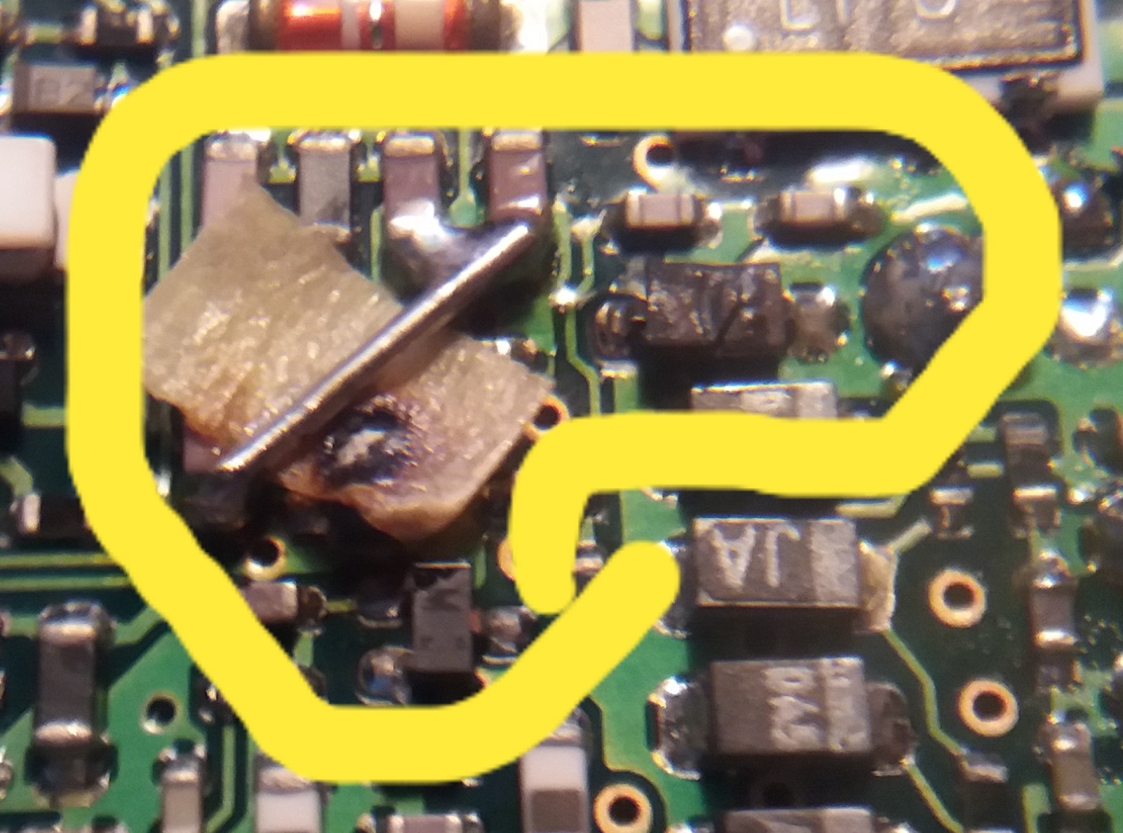 Popatrzyłem na schemat i ten drucik nie robił żadnego obejścia, on łączył masy i przytrzymywał ten papierek nad spalonym elementem (może tak miało być fabrycznie?) bo widać że upalony element przepalił również ten papierek. Nie wiem o co tu mogło chodzić.