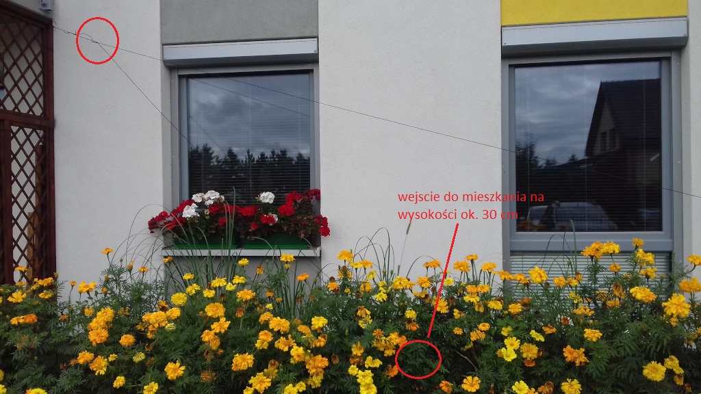 W kilku miejscach antena ociera się o ogrodową roślinność. Wejście anteny do budynku pokazałem na ostatnim zdjęciu okręgiem na tle wyjątkowo wybujałych aksamitek. Wejście znajduje się na wysokości ok. 30cm ponad gruntem a sama antena ma jeszcze ok. 2m wewnątrz mieszkania gdzie stoi ATU i nadajnik (tuż przy prawym oknie na ostatnim zdjęciu).