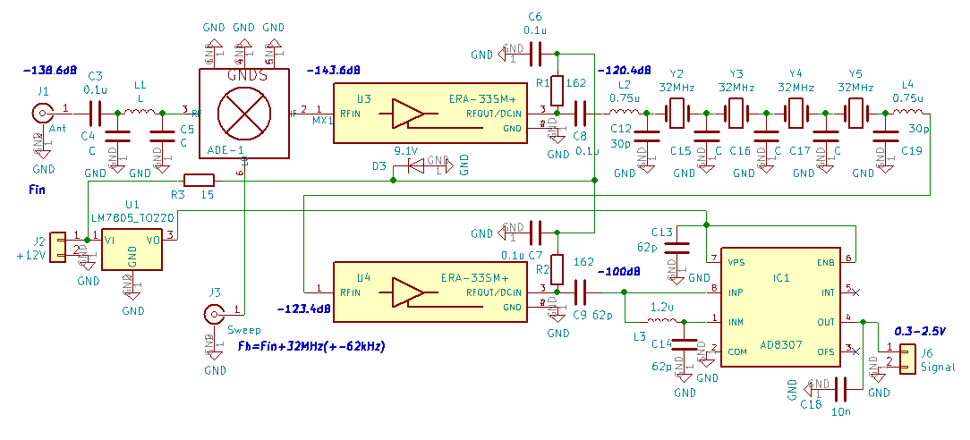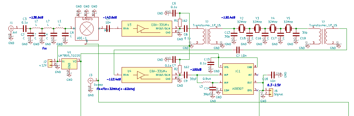 Pokazane rozwiązanie to na razie część odbiorcza całości, już projektowana w Kickad-zie. Na wejściu działa filtr LPF o częstotliwości 30MHz, kolejno jest mieszacz zintegrowany z pośrednią 32MHz, wzmacniacz ERA3, prosty filtr kwarcowy 32MHz dopasowany z obu stron za pomocą sekcji LC (Lmatch), kolejny wzmacniacz i jako detektor sygnału AD8307. Na rysunku podałem spodziewane poziomy mocy zakładając, że AD8307 zadziała od -70dbm (-100dB). W tym zestawieniu możliwe jest uzyskanie czułości na poziomie ok. 0.7-1uV (ok. S3). Heterodyna to SI5351 strojona w najszerszym zakresie mniej więcej +- 66kHz ale jeśli próby wypadną pozytywnie to nawet +-112KkHz. Dolną granicą przemiatania będzie chyba zakres +-1.2kHz a może nawet +-2.4kHz co ma związek z dającym się uzyskać pasmem filtra kwarcowego.