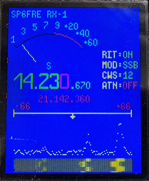 - dół ekranu to waterfall, jego punkt środkowy odpowiada częstotliwości F0, pozioma linia opisuje szerokość przemiatania a 12 ostatnich linii pokazuje siłę sygnału w paśmie przemiatania.