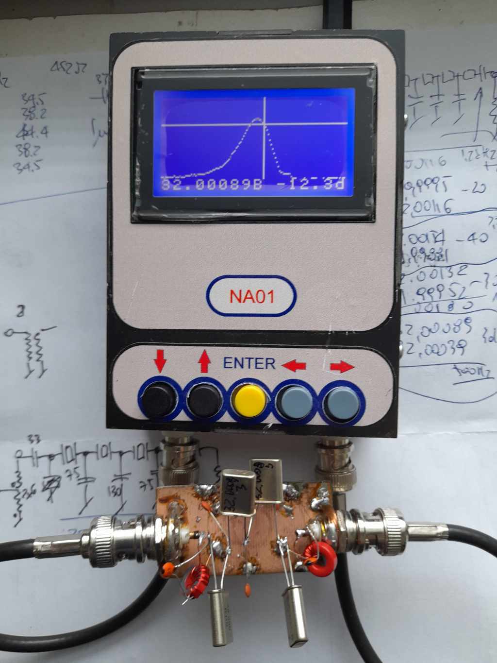 Tymczasem zakupiłem kilka kwarców 32MHz i złożyłem próbnie filtr kwarcowy posiłkując się procedurą projektową opisaną właśnie w wątku z NA01: