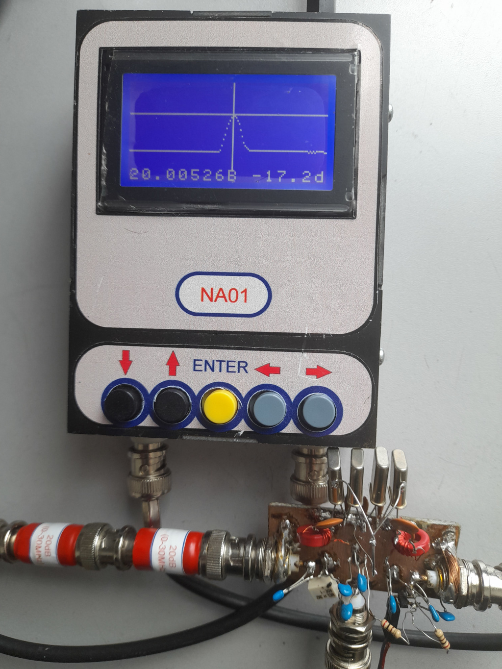 Układ zmontowałem aby sprawdzić obliczenia dynamiki lub inaczej możliwej dolnej granicy pomiarowej. Okazało się, że filtr ma 5-6dB większe tłumienie niż zakładałem a wzmacniacze ERA mają o 2-3 dB mniejsze wzmocnienie. Powoduje to ubytek w bilansie co najmniej 10 dB i zastanawiam się gdzie to odzyskać.
