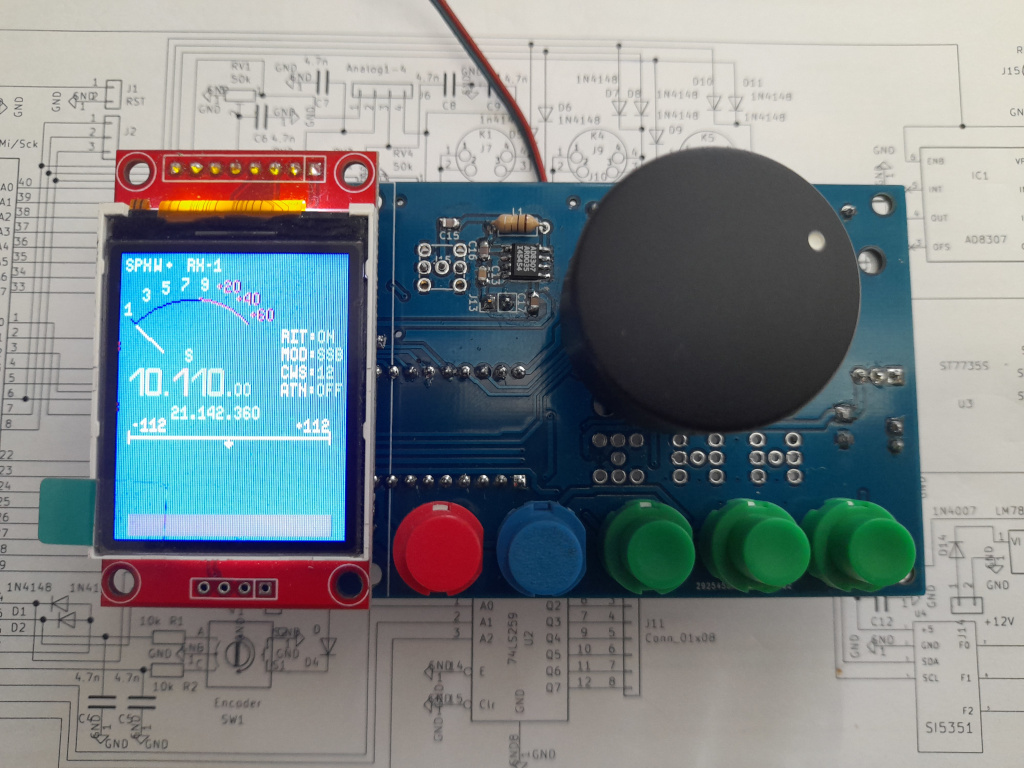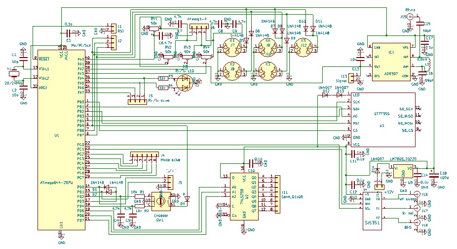 Podstawowa część uległa niewielkiej zmianie, zrezygnowałem z 7 przycisków na rzecz pięciu ze względu na brak miejsca i przerzucenie zmiany funkcji na impulsator. Na płytce znalazło się miejsce na diodę O/N, wyjście dla sterownia 8 pasm, sygnalizację O/N, tryb pracy (CW,SSB), klucz elektronowy oraz wejcia analogowe na przykład na pomiar SWR.