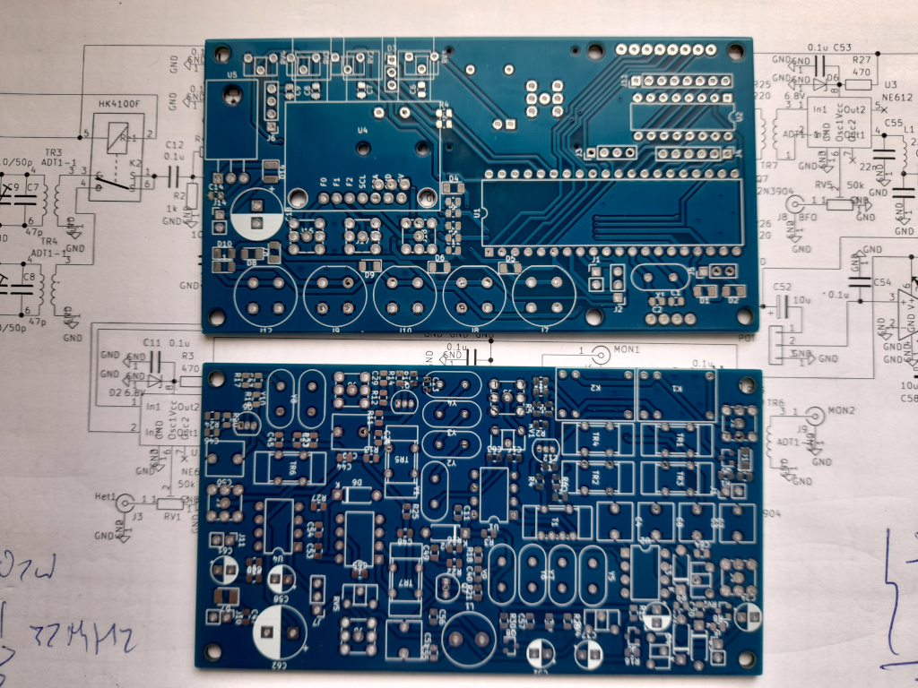Zrobiłem dwie płytki o rozmiarze 59/110mm - jedną dla wyświetlacza z procesorem, enkoderem, generatorem oraz detektorem AD8307 i drugą z częścią odbiorczą dla dwóch pasm.
