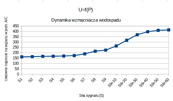 A na razie odbiornik wodospadu działa w przybliżeniu według założeń. Zmierzyłem sygnał na wyjściu odbiornika a w zasadzie na wyjściu detektora AD8307 w funkcji napięcia (siły sygnału S) na wejściu odbiornika.